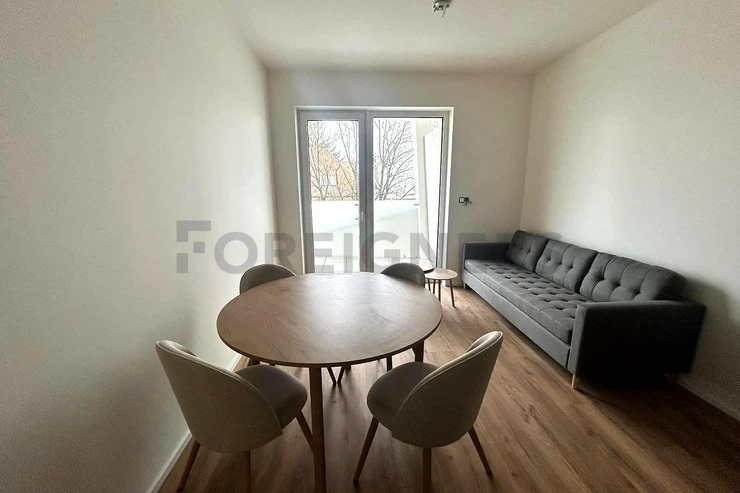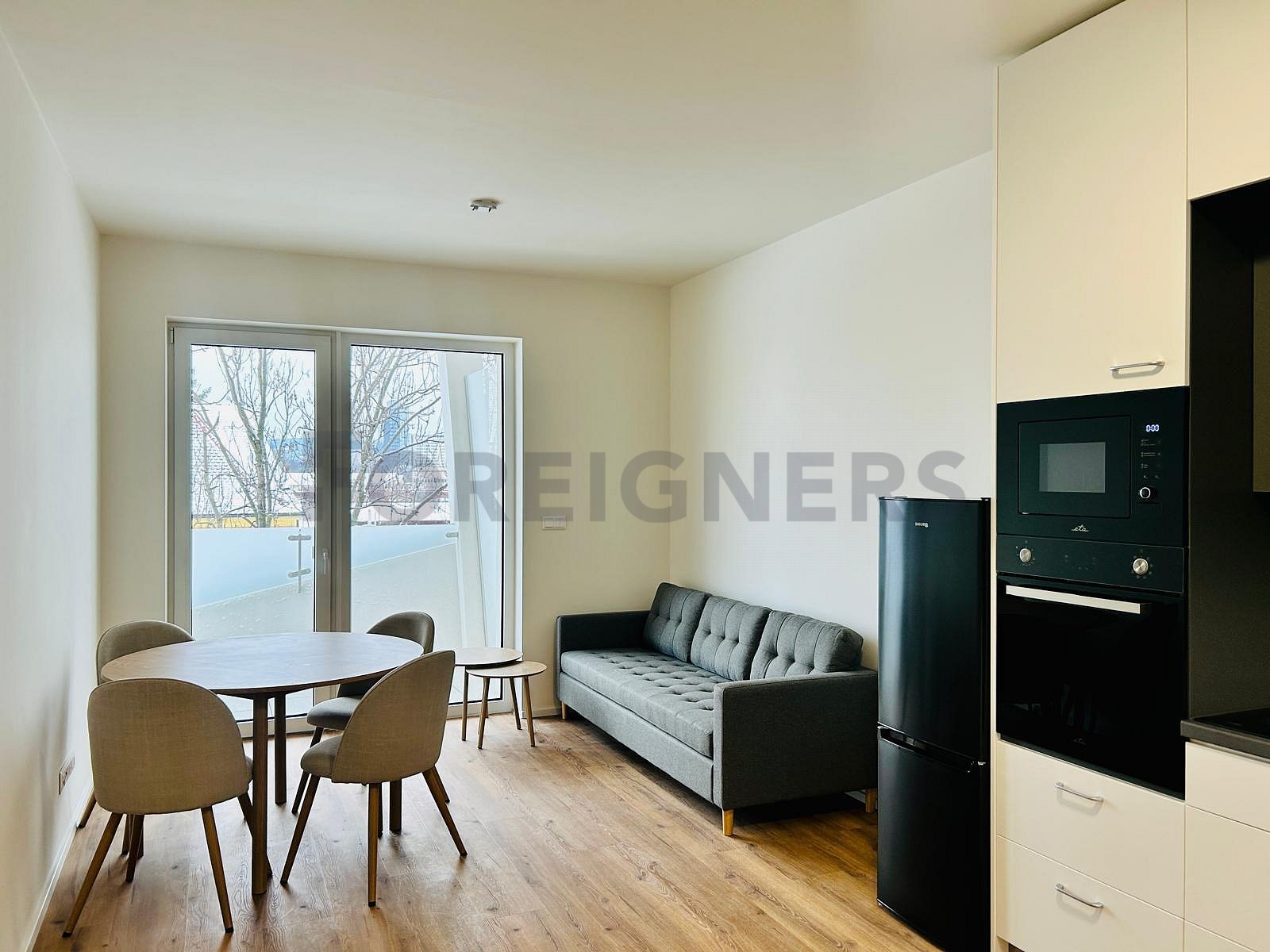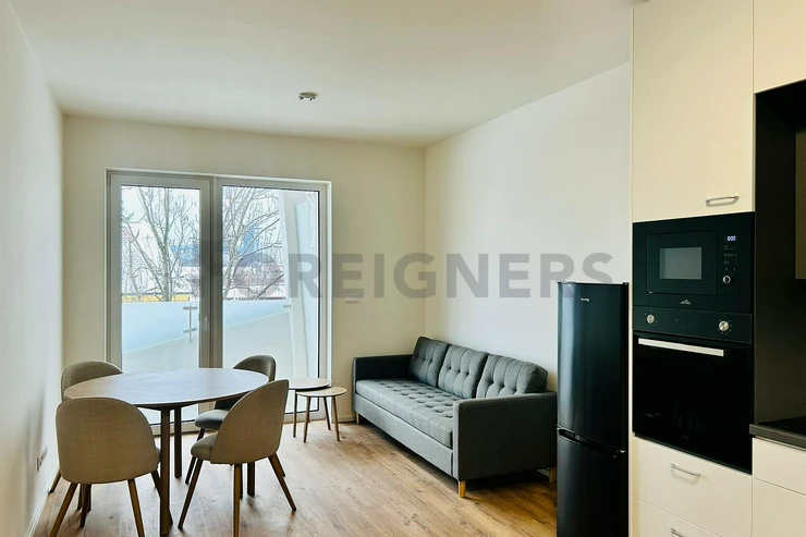 The apartment is partly furnished, including a kitchen unit with built-in appliances, a bed, a wardrobe, a sofa, a dining table, and two chairs.