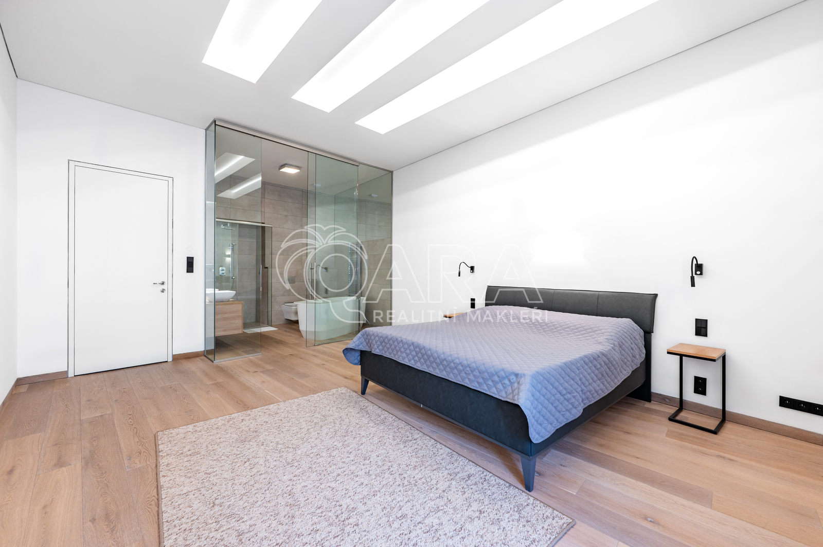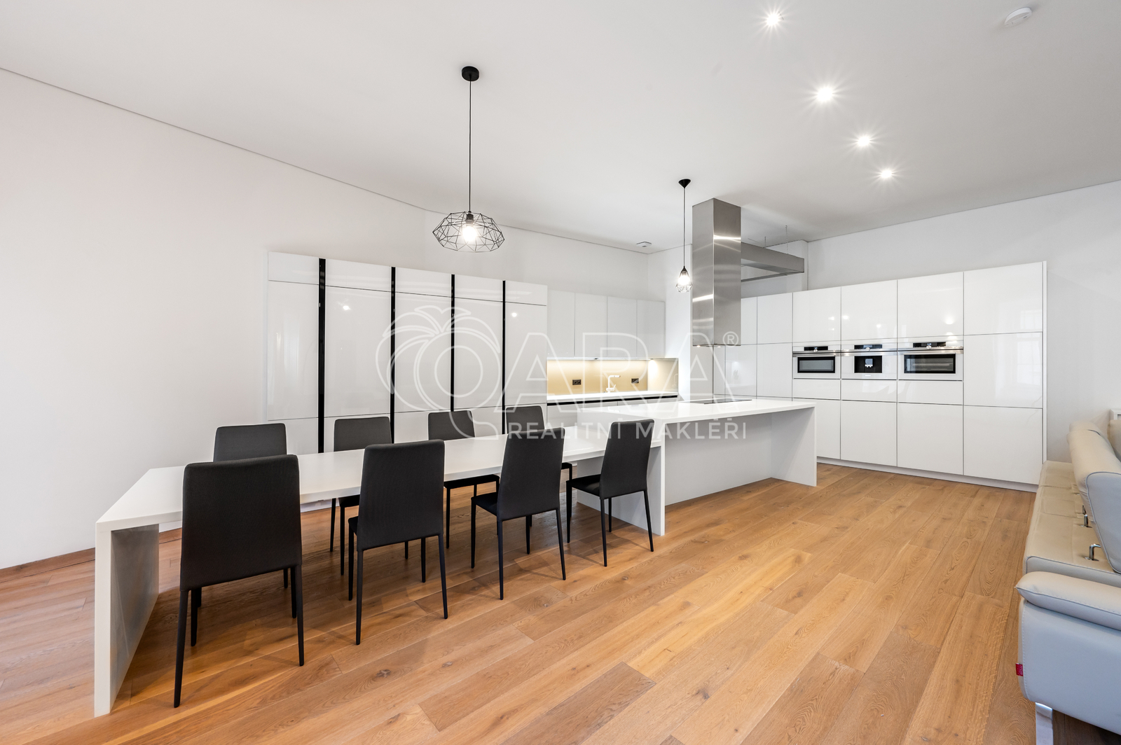 The apartment is rented with premium furnishings. It includes a fully equipped kitchen (induction hob, electric oven, refrigerator, freezer, dishwasher, microwave), a dining table with chairs, a stylish sofa, TV, comfortable seating furniture, a luxury king-size bed in the master bedroom, and the second bedroom is unfurnished. The bathroom is equipped with Preciosa brand products and heated flooring. The apartment has wooden floors, plenty of storage space, and high ceilings that ensure ample light. Radiant heating and cooling are integrated into the ceilings. The apartment also features a smart home control system and a forced air exchange system. Wi-Fi is available. The interior design, with an emphasis on functionality and style, was handled by the renowned architectural studio de.fakto. Parking can be arranged at the Palladium shopping center.