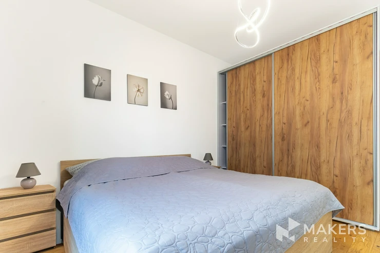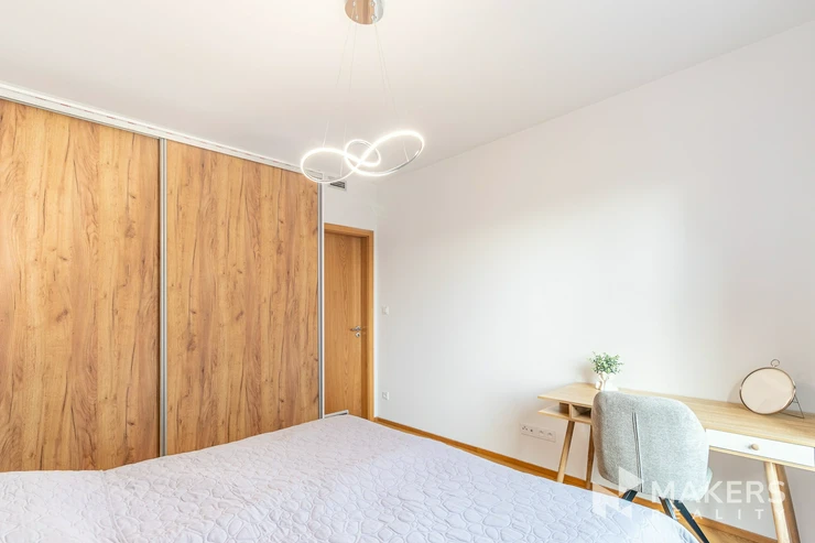 The bedroom offers peace and comfort. It features a double bed with two bedside tables and lamps, spacious built-in wardrobes, and a work corner with a desk and chair by the window — ideal for working or studying.