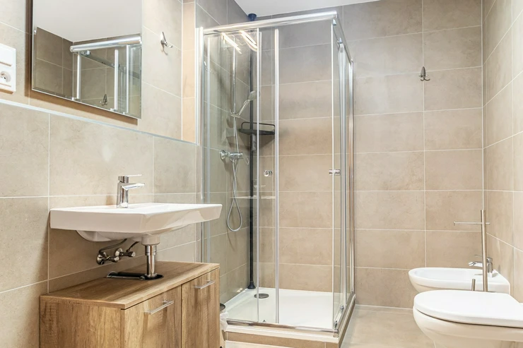 The bathroom is modern and spacious, with light tiles that enhance the feeling of cleanliness and brightness. It includes a shower, washbasin with storage, toilet, bidet, and washing machine.