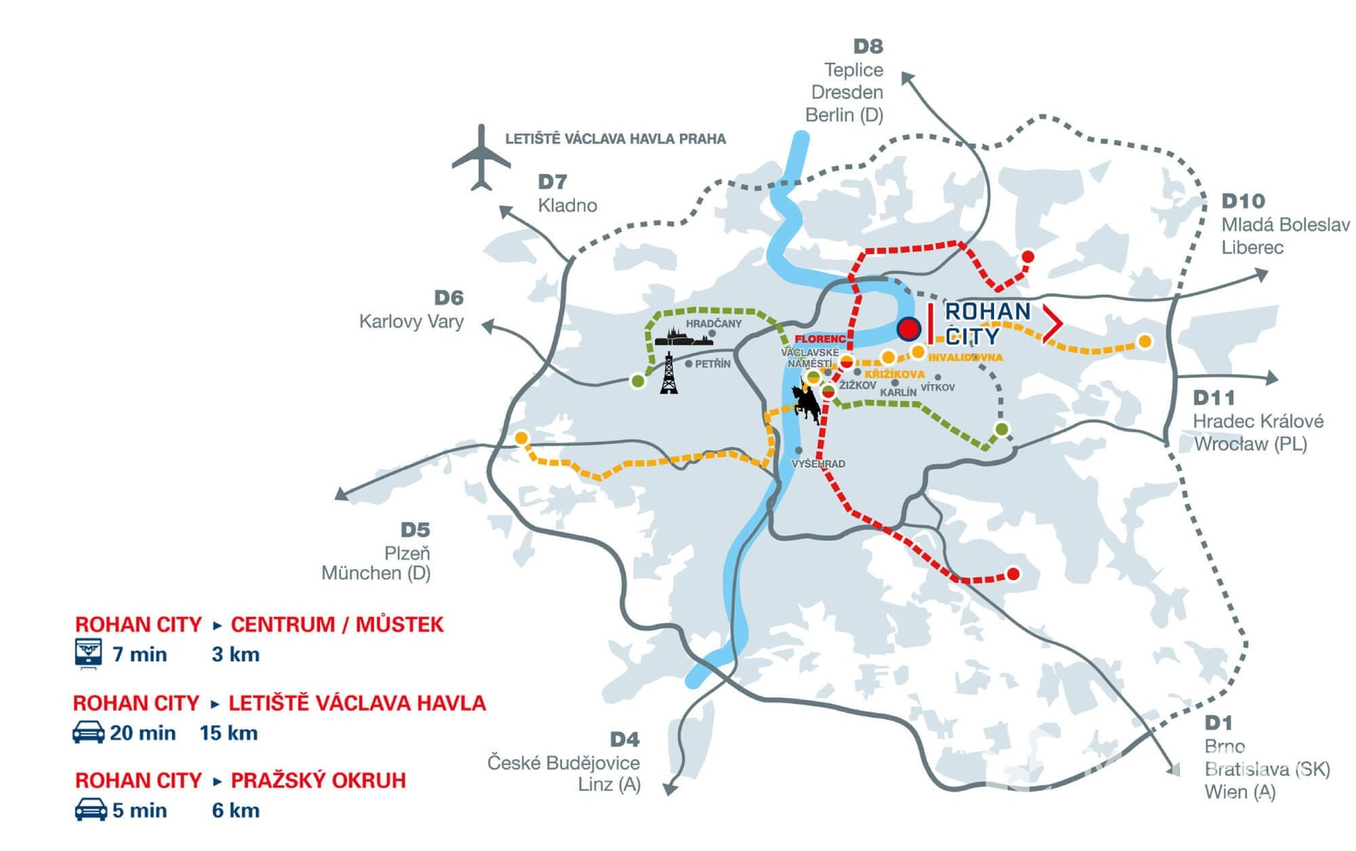 Karlín is one of Prague’s most sought-after districts, combining a vibrant city lifestyle with greenery and tranquility by the river. Within walking distance, you’ll find the Invalidovna metro station (yellow line B), tram and bus stops — with just a 7-minute ride to the city center. Nearby are cozy cafés, restaurants, a gym, the Albert supermarket, and several parks perfect for walks and outdoor relaxation.