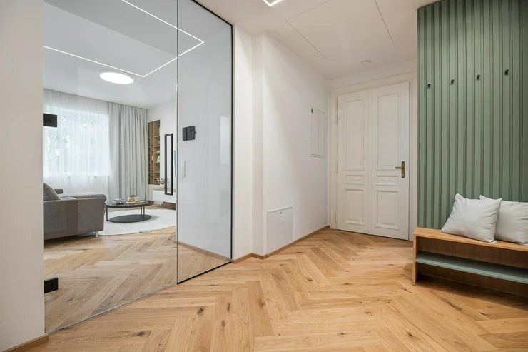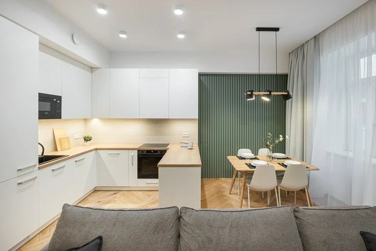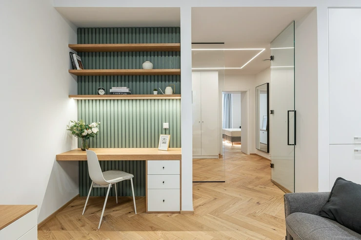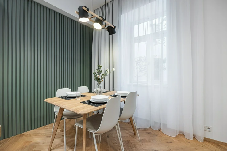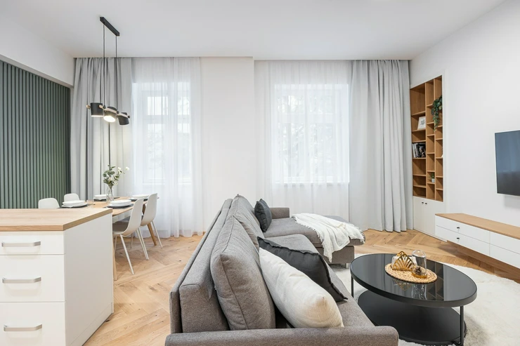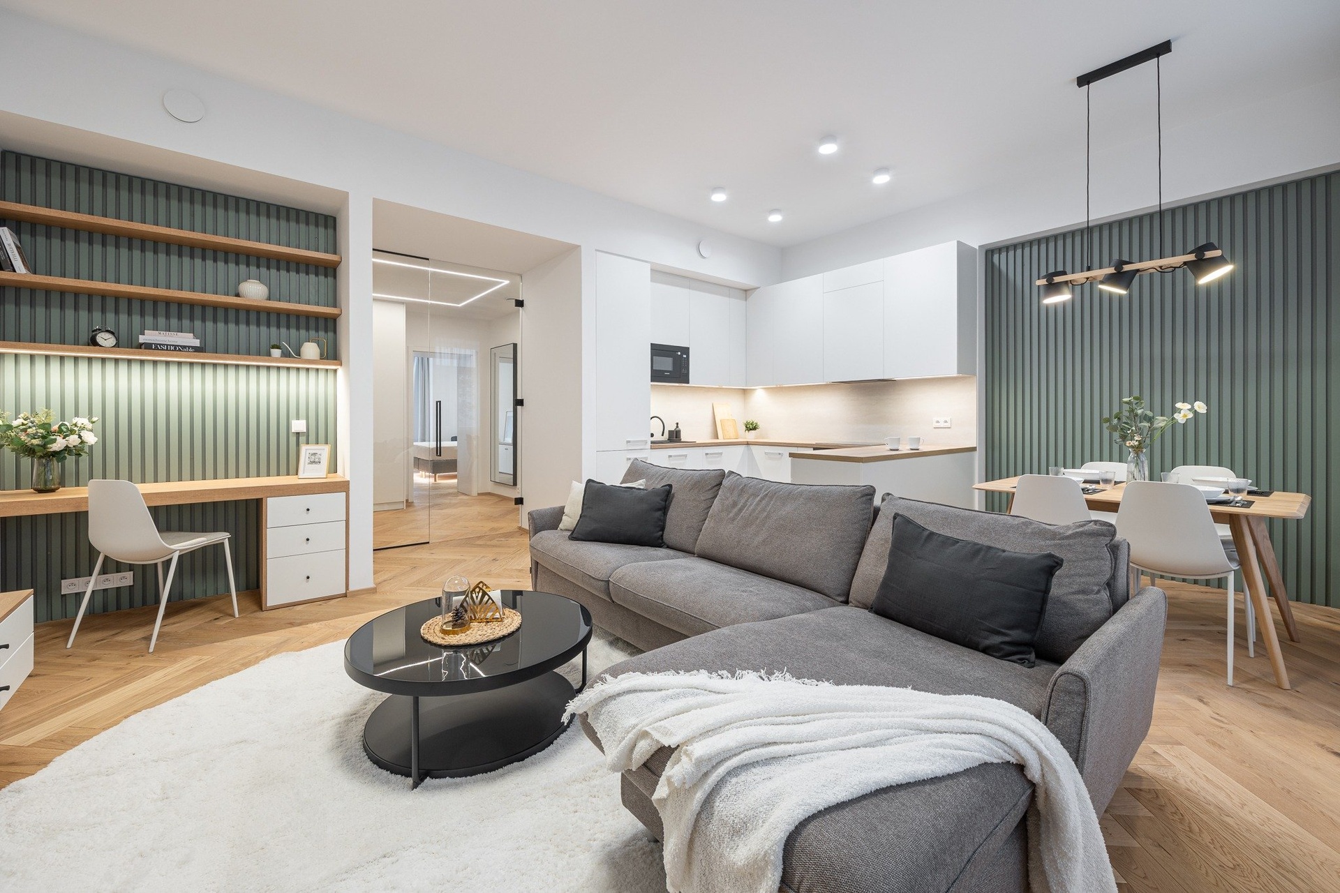 Each apartment includes a high-quality custom kitchen made by Czech craftsmen, stylish furniture, premium appliances, a smart home system, and fast internet.