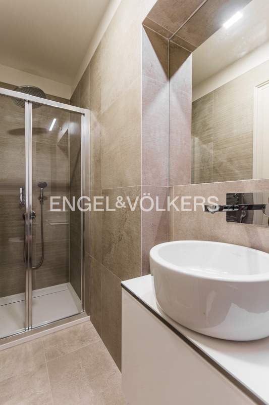 The spacious and bright living room with a dining table is the heart of this wonderful apartment. The separate, custom-made Italian kitchen with all appliances offers all the comforts of modern cooking. The master bedroom, facing a quiet courtyard, is connected to its own bathroom and offers plenty of storage space. The modern family bathroom has a bathtub, sink, toilet, and bidet.