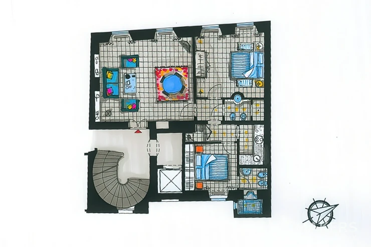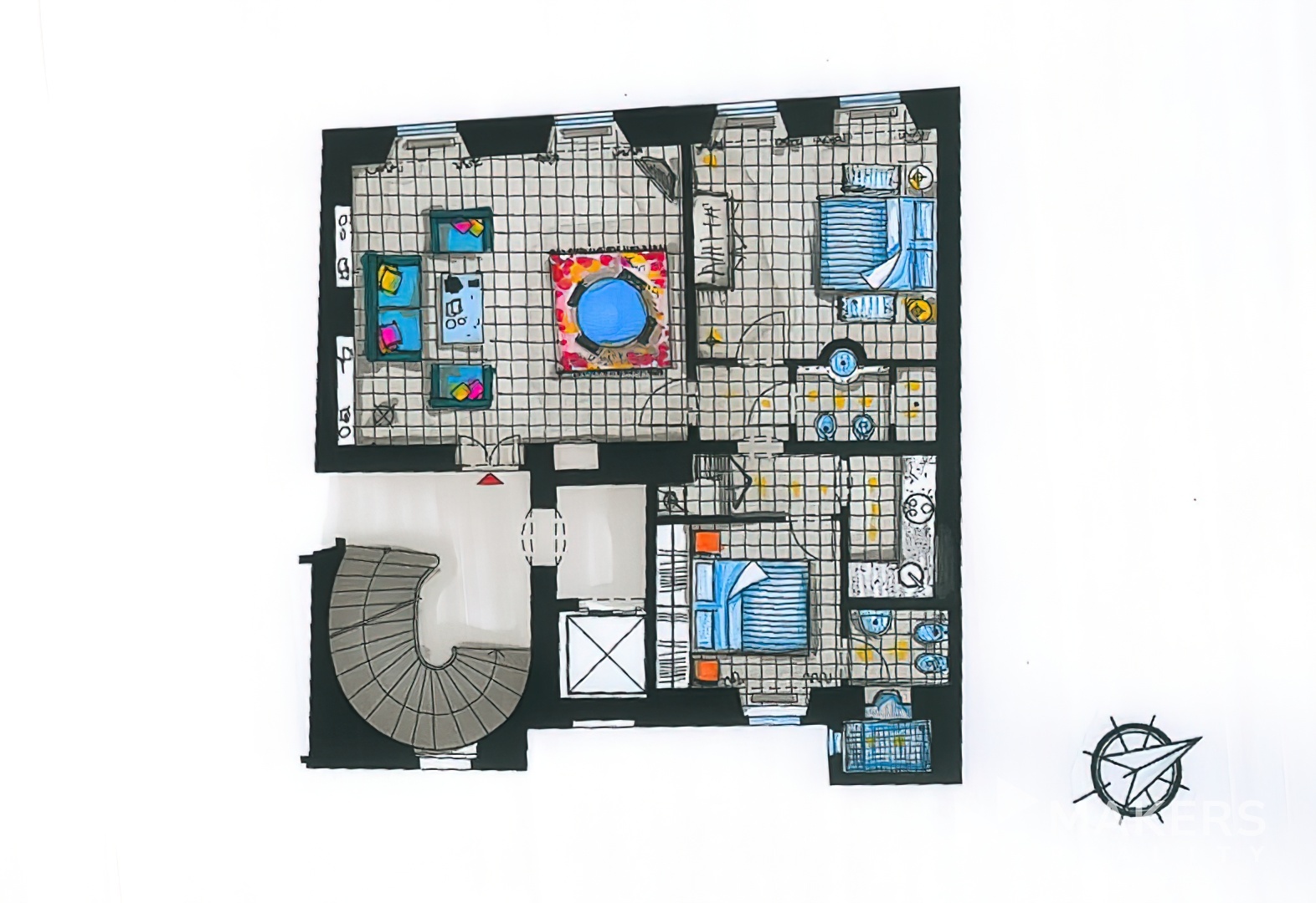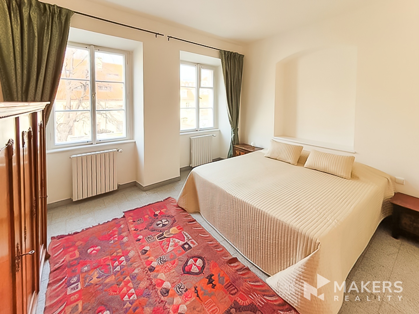The interior consists of a spacious living room with a dining area, a decorative fireplace, and a beautifully preserved hand-painted wooden ceiling. The kitchen is separate and fully equipped with modern appliances. The apartment features two private bedrooms and two bathrooms — one with a bathtub and the other with a shower. There is also a utility room with a washing machine and dryer. All furniture has been tastefully selected to complement the historical character of the space while providing a high level of comfort.