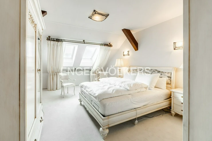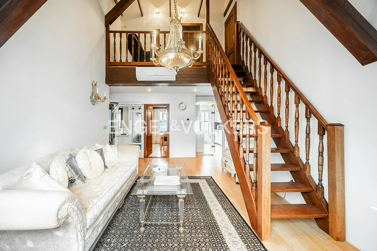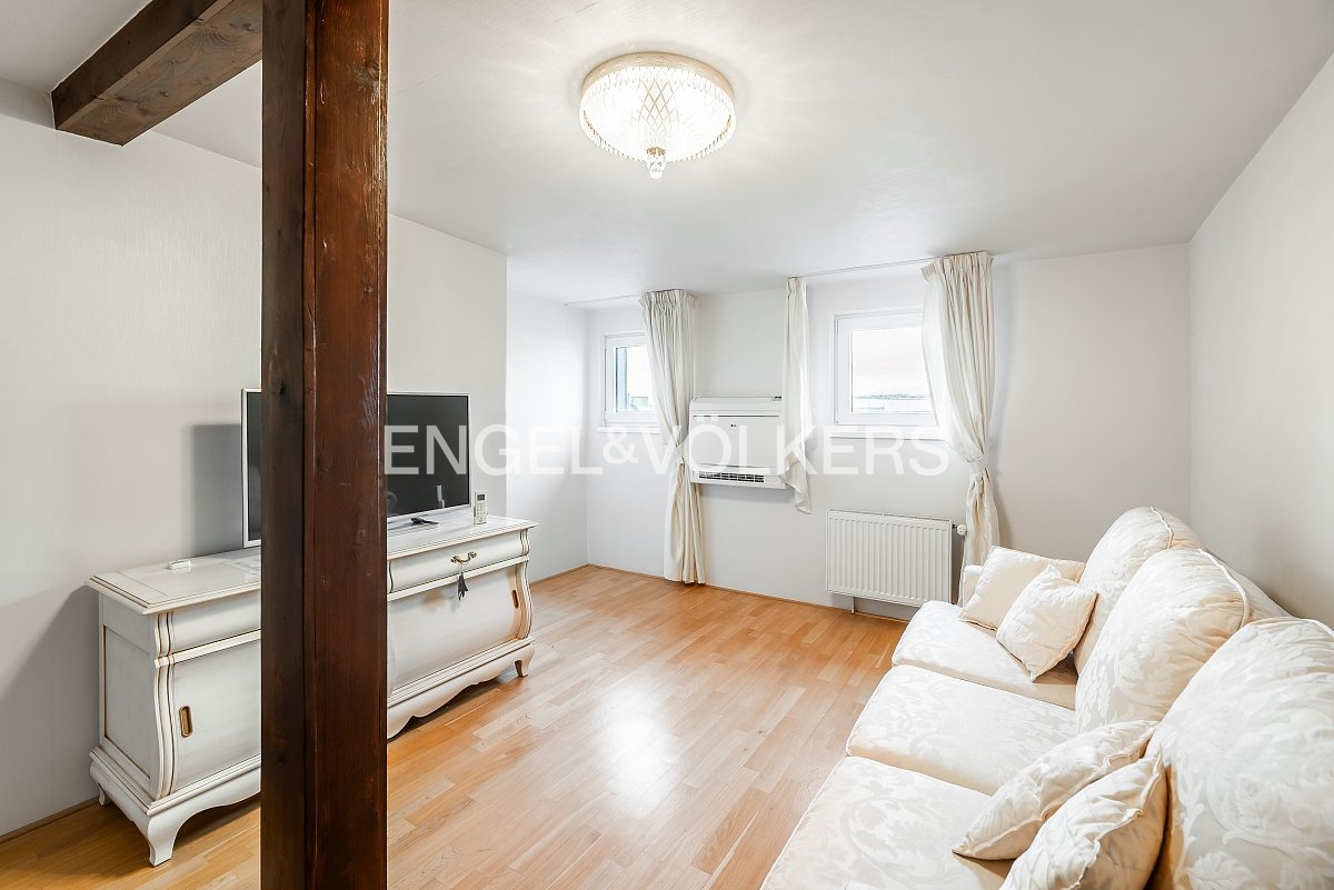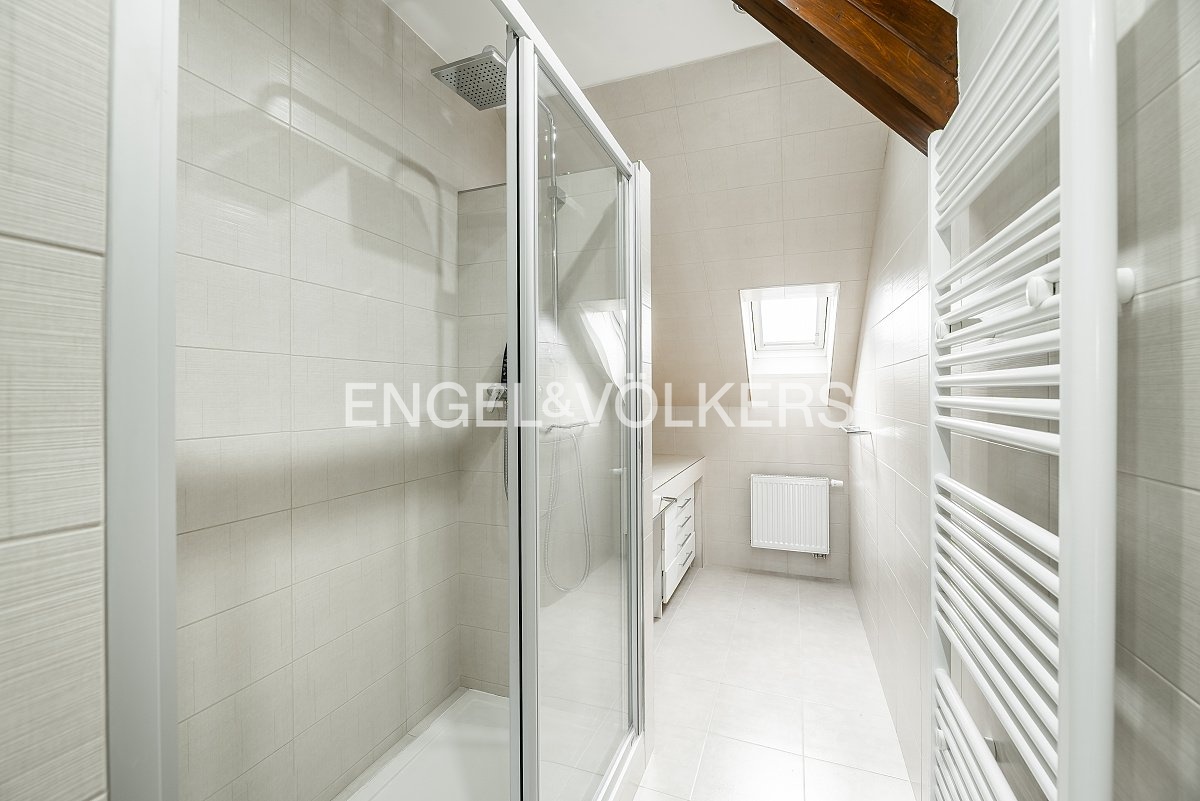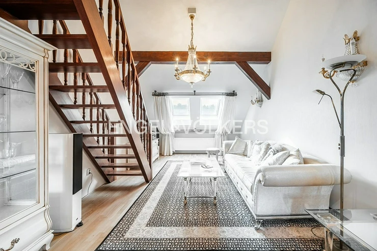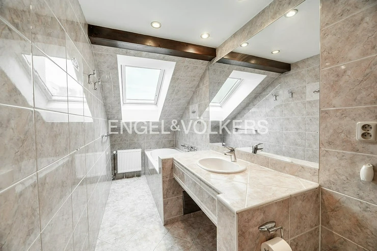 The duplex 4+kt apartment is located on the seventh and top floor of a brick residential building in the heart of Karlín.