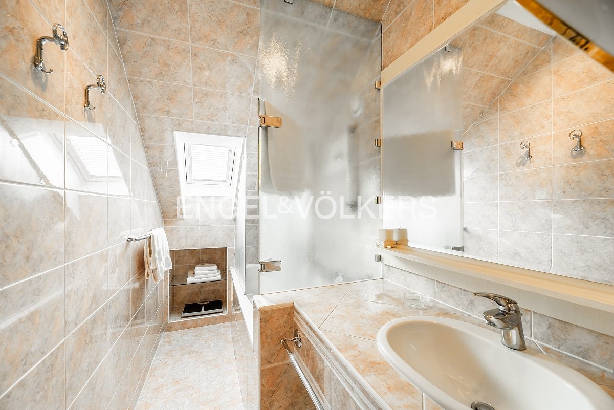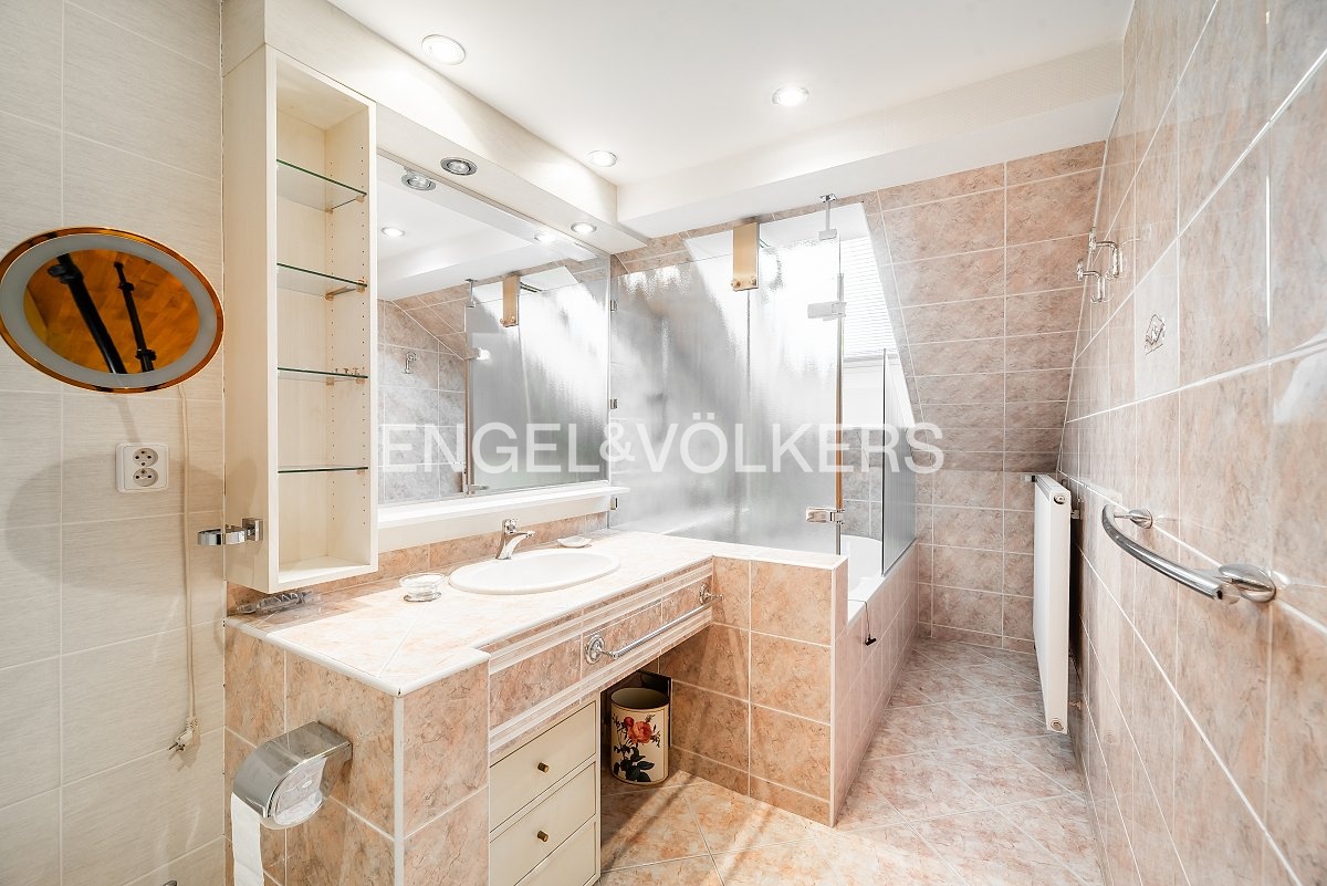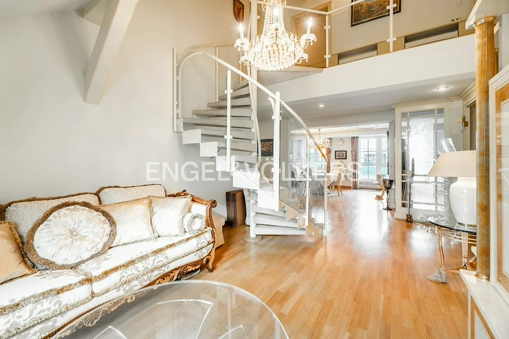 The first floor consists of an entrance hall with built-in wardrobes, leading to a spacious living room with a dining area and a fully equipped kitchen with high-quality appliances, separated by a partition. The last room on the lower level of the apartment is a bathroom with a bathtub. The living room opens onto a 34 sqm terrace facing the courtyard.