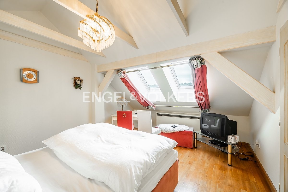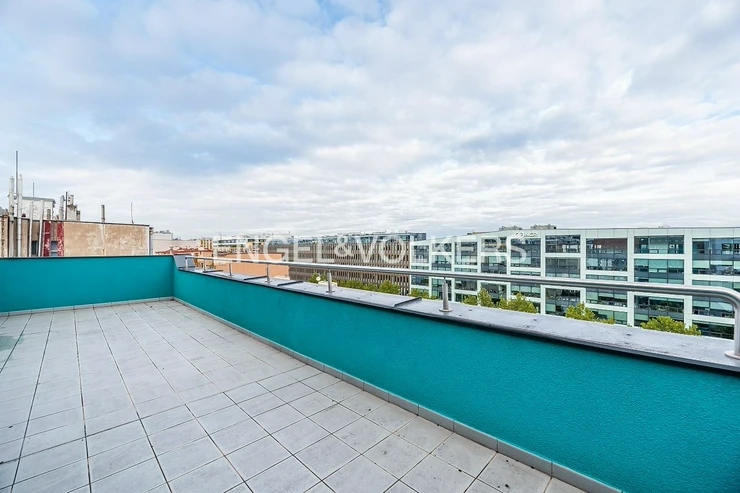 The duplex 3+kt apartment is located on the seventh and top floor of a brick residential building in the heart of Karlín.