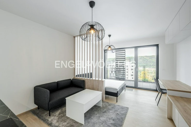 Available for long-term is a fully furnished 1-kt apartment with an area of 32.2 sqm, located on the 11th floor of the modern Zahálka residence, offering views of the Vltava River.