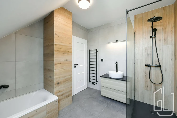 V horním patře se nachází tři ložnice s vestavěnými úložnými prostory, koupelna s vanou, sprchovým koutem a druhou toaletou a přístup na terasu (20 m) orientovanou do klidného vnitrobloku.