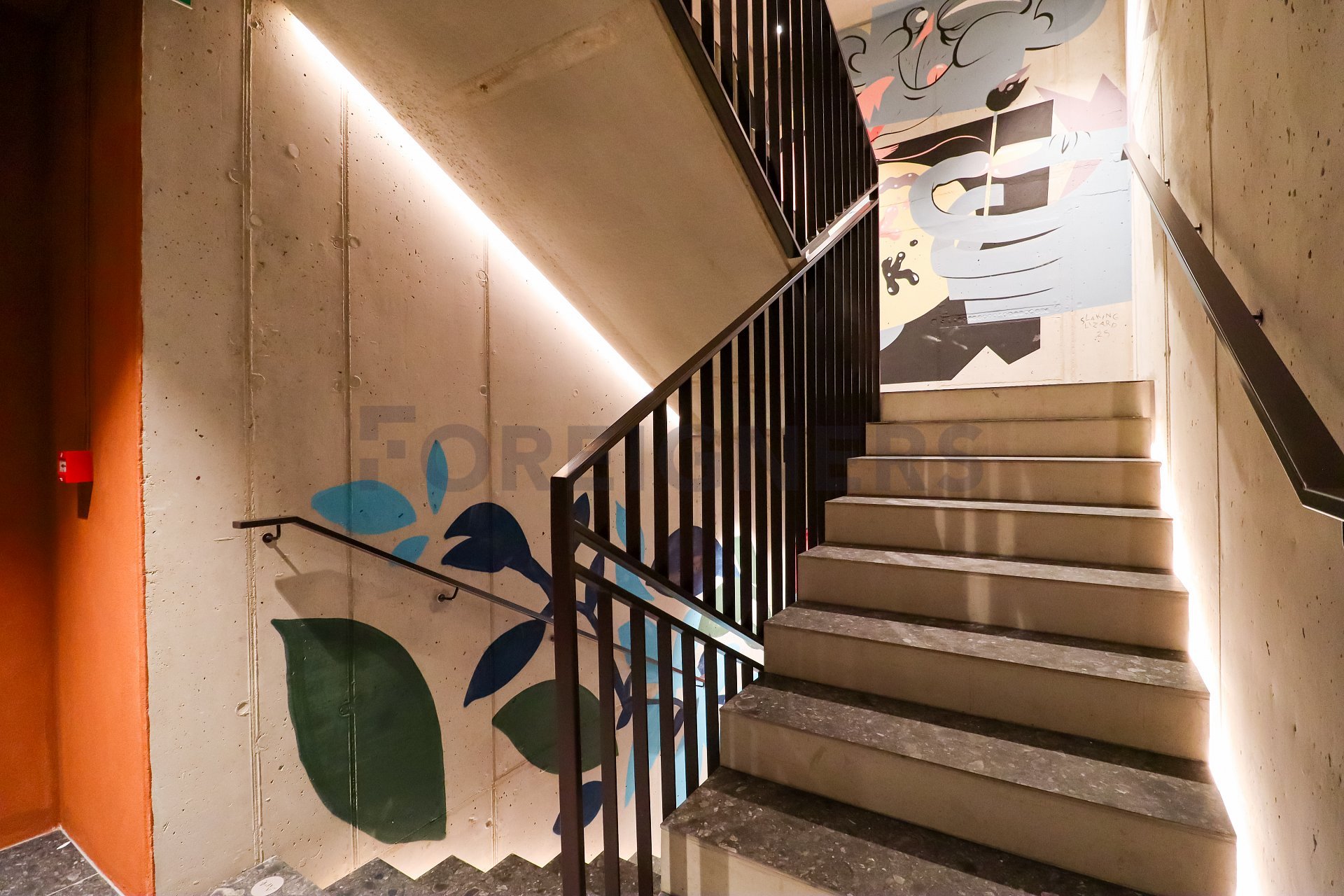 The studio is situated in a modern building with an elevator and stands out for its high-quality industrial design combining concrete elements, warm tones, and elegant lighting.