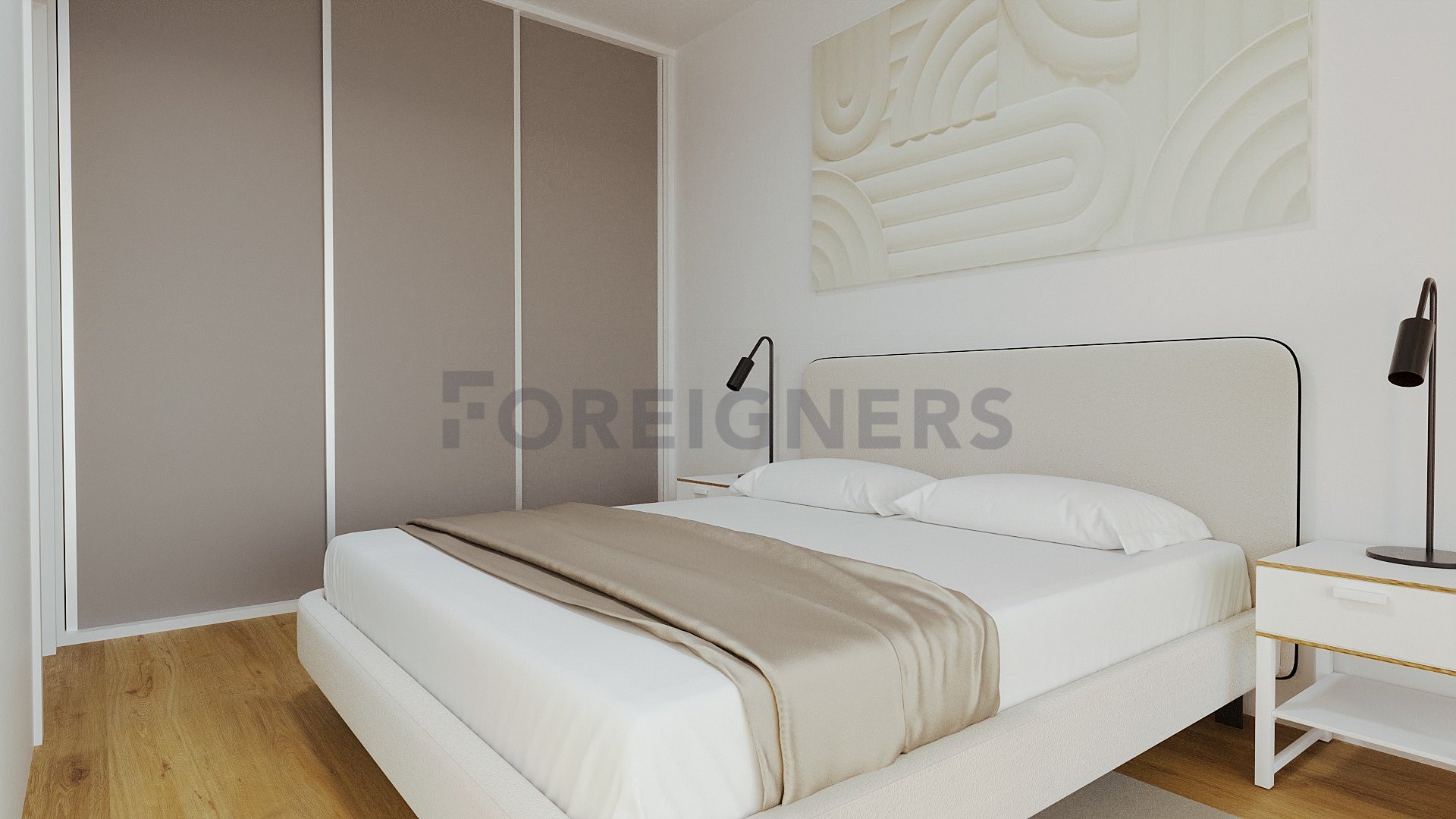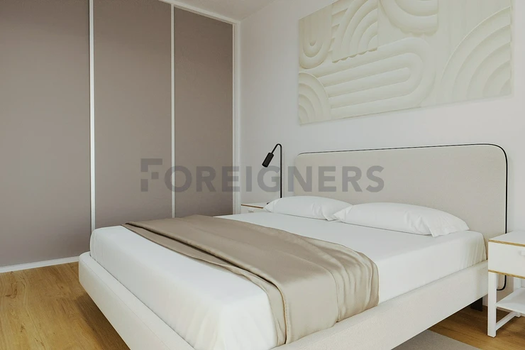 The apartment includes two bedrooms – a master bedroom with a double bed, bedside tables, and ample storage space, and a second room currently used as a study or children’s room, furnished with a single bed, desk with chair, and built-in storage.