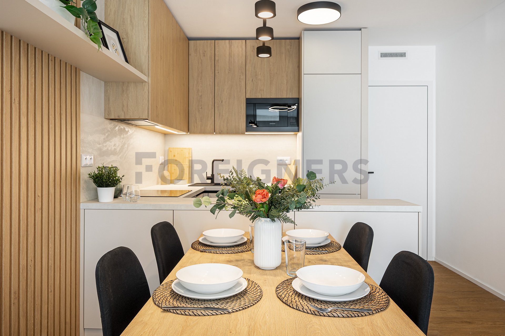 The apartment is equipped with a heat recovery ventilation system (rekuperace) providing constant fresh air and reduced energy consumption. Exterior blinds protect the interior from overheating, allow smooth light control, and provide privacy without compromise. The apartment also features a smart home system for easy control of ventilation, entrance doors, and energy management.