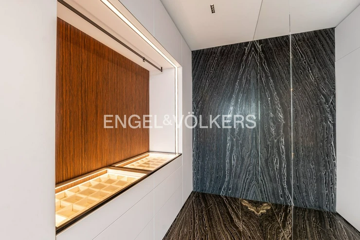 The dominant feature of the apartment is a spacious living area with a custom-designed kitchen. There are also two bedrooms, two large bathrooms with bathtubs, a separate toilet with a utility room, and a dressing room. The interior is designed with an emphasis on detail and practicality, as evidenced by the built-in multifunctional furniture and ample storage space. The entire apartment is finished with top-quality materials – natural marble floors and bathrooms, and premium fittings.