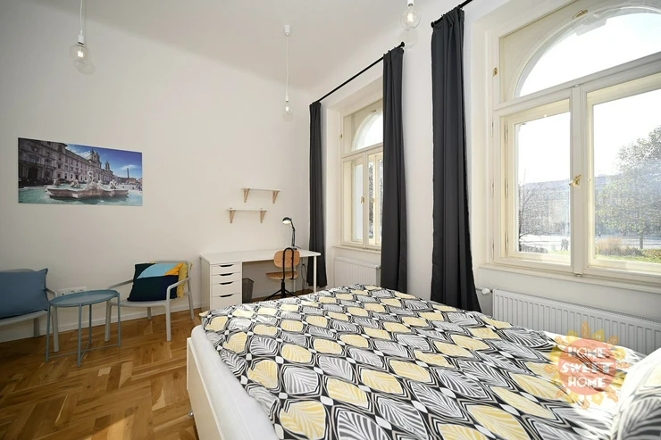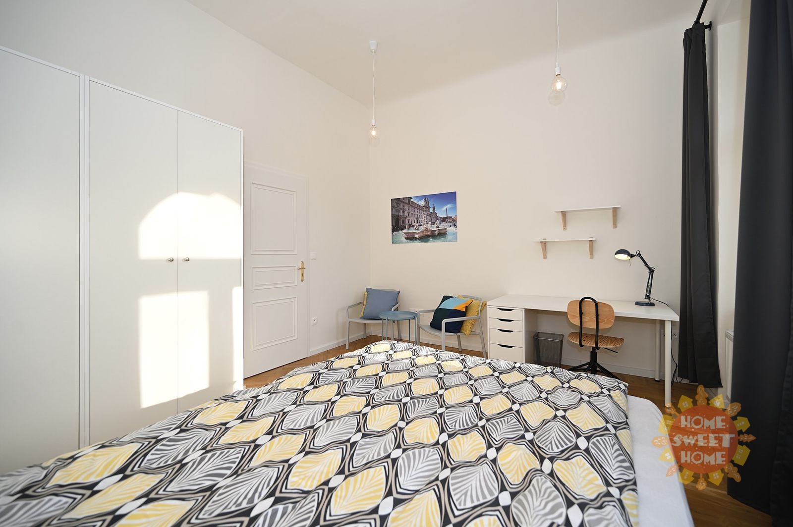 We offer a beautiful, fully furnished 16 m² room with a double bed, located on the raised ground floor of a brick building in the Kinských Residence on náměstí Kinských, Prague 5. The building underwent a complete renovation in 2019. The room is part of a four-bedroom apartment with a fully equipped kitchen, dining area, two bathrooms, and a separate toilet. The common areas are fully equipped, including an iron, cleaning supplies, and other essentials for everyday living. The private lockable room is furnished with a double bed, desk, armchair, wardrobe, duvet, and pillow Internet access and weekly cleaning of shared areas are already included in the rent. Residents can also enjoy access to a fitness, laundry room (coin-operated), and a shared terrace.