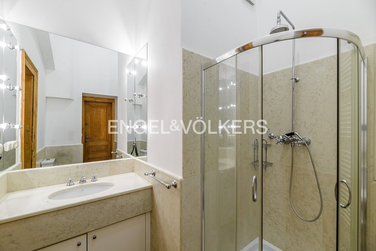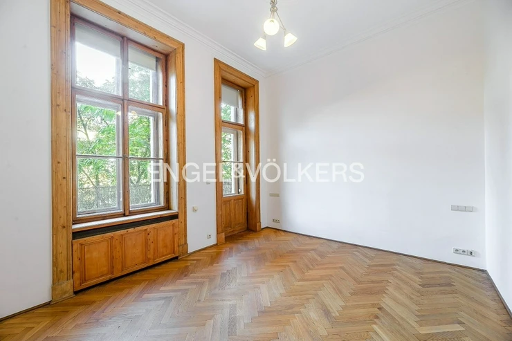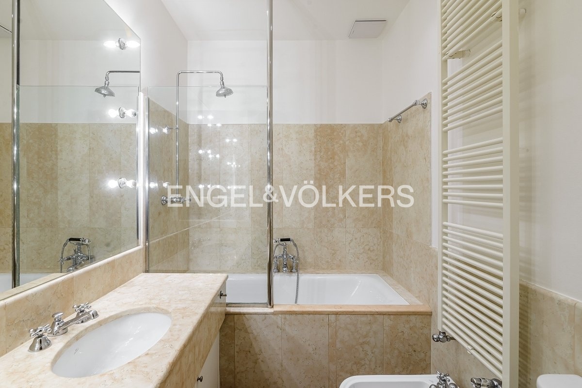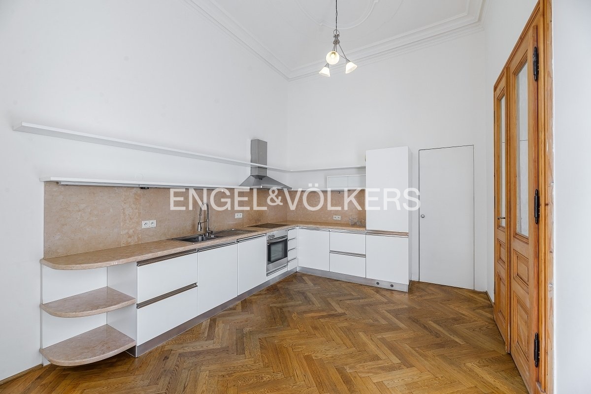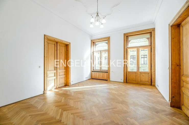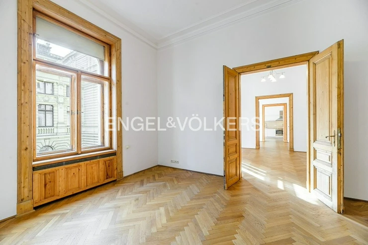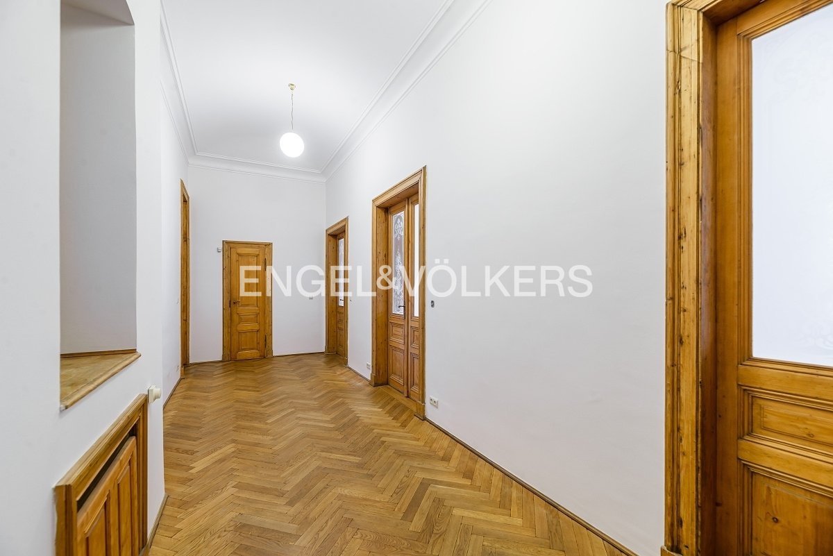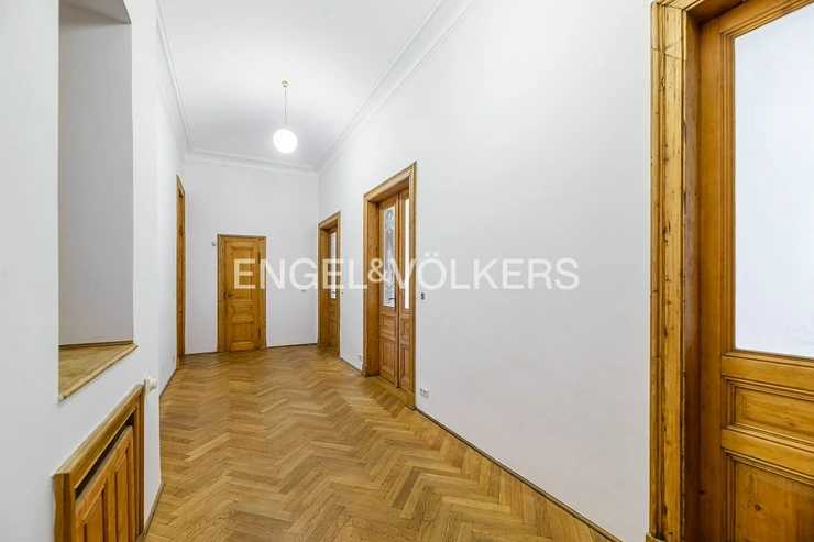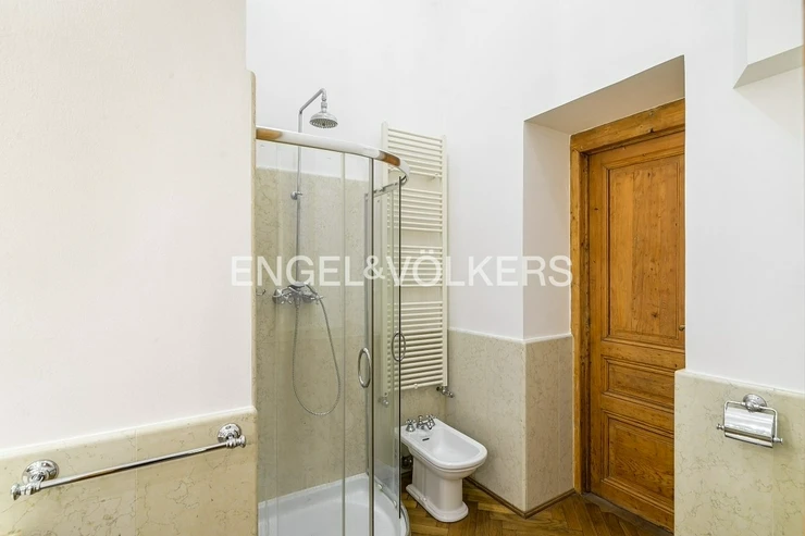 The apartment has a bright living room, a kitchen that is fully equipped with all Miele appliances and four other rooms that are spacious and airy with high ceilings decorated with stucco.