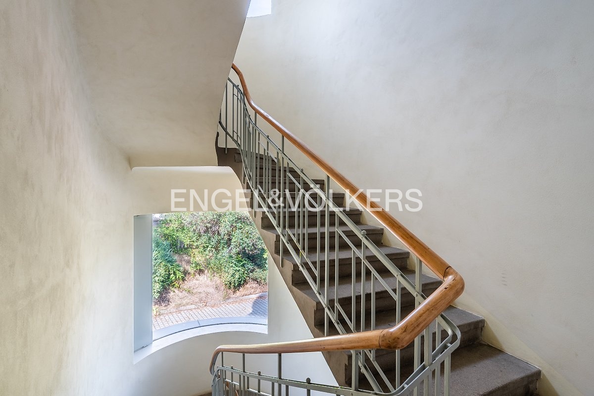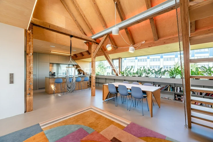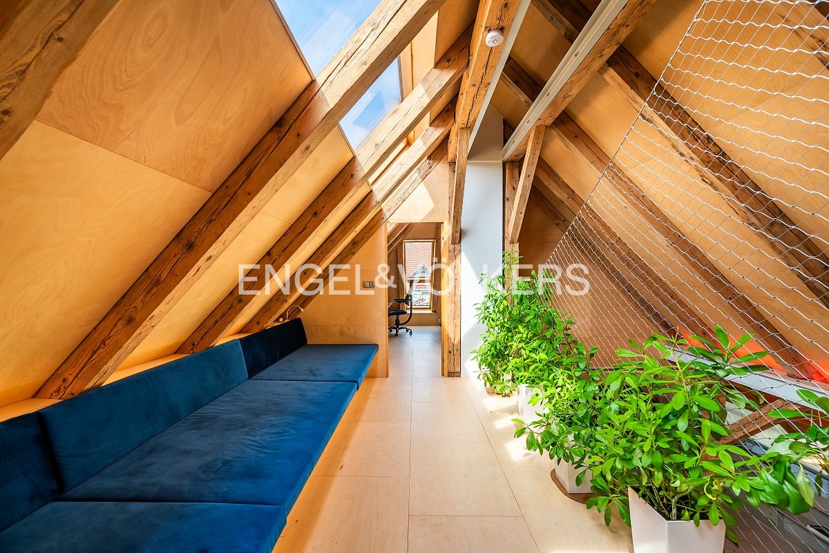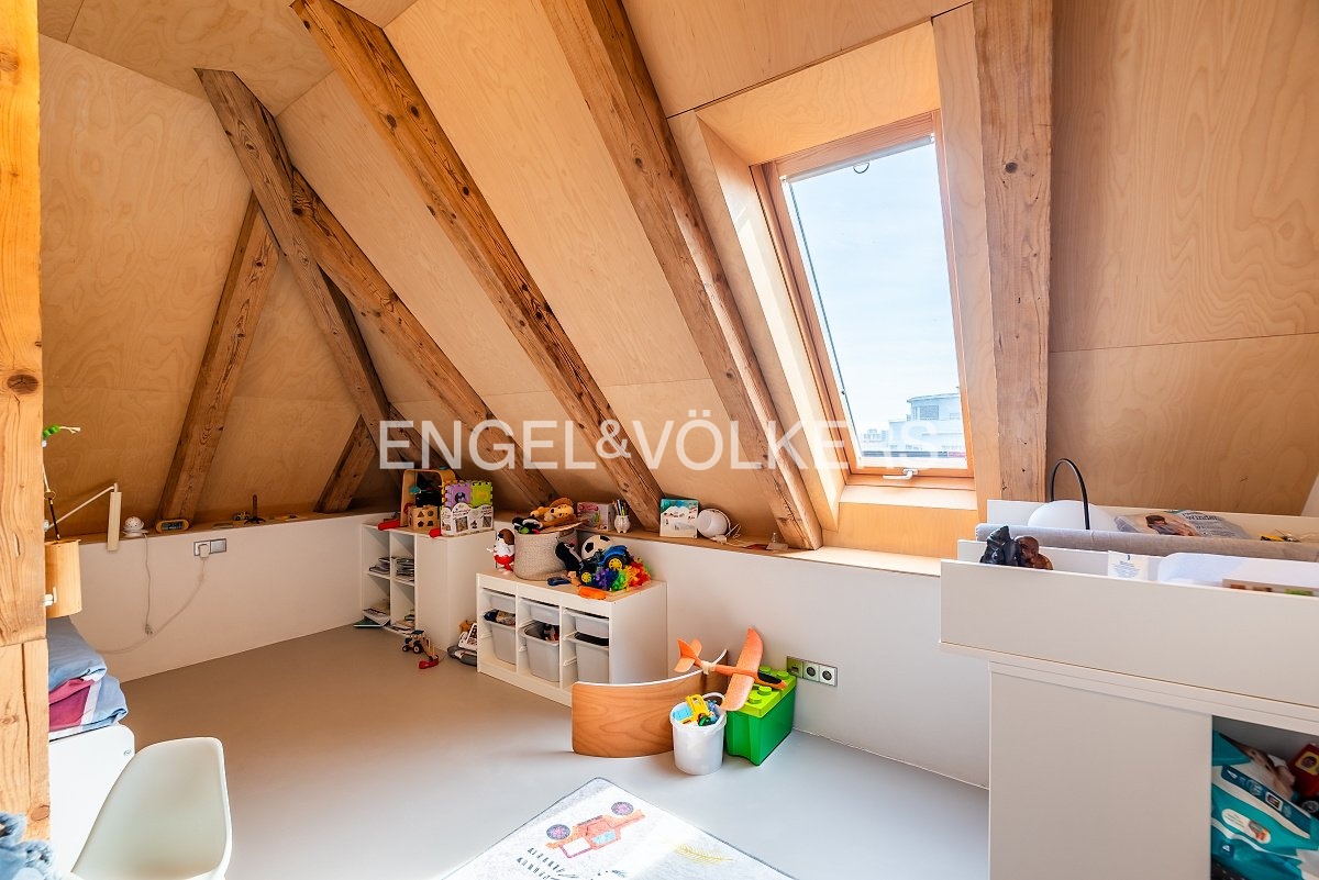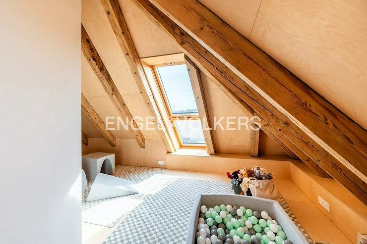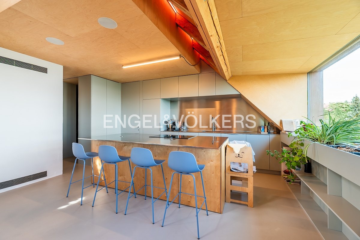 The lower part of the apartment features a generous living area with a fireplace, a dining room, and a fully equipped kitchen with a kitchen island and top-of-the-line Siemens built-in appliances, including an induction hob with a built-in extractor hood. There is a master bedroom with a dressing room and built-in wardrobes, another bedroom, two bathrooms (bathtub, shower, bidet, toilet, utility room), a large storage room/pantry, and an entrance hall with built-in storage space. The living room and master bedroom have access to the terrace. The upper floor offers two rooms – ideal as a study, guest room or for older children – and a second north-facing terrace.