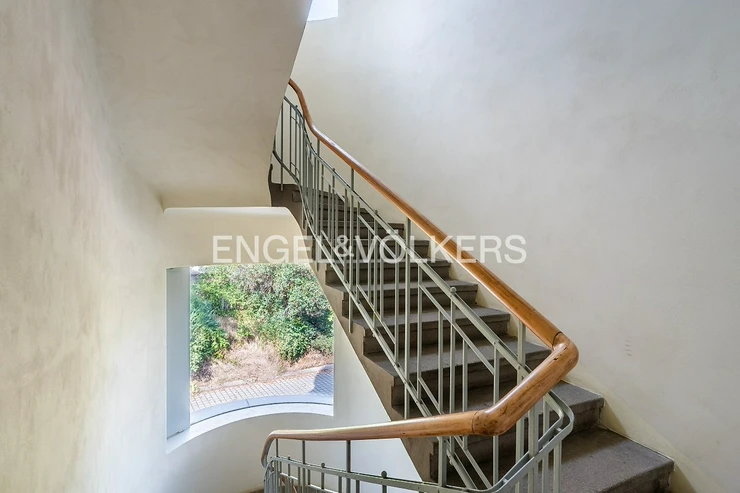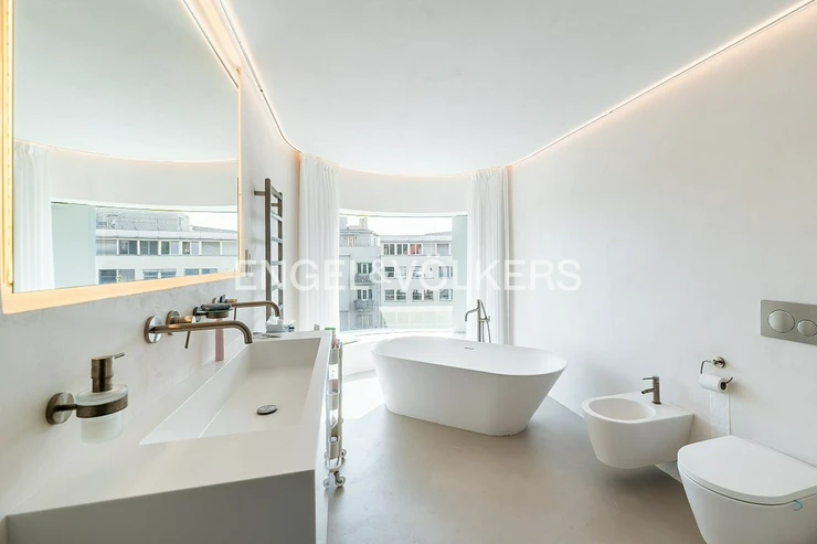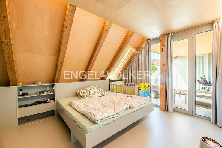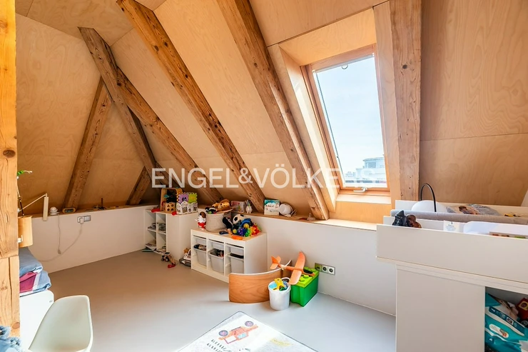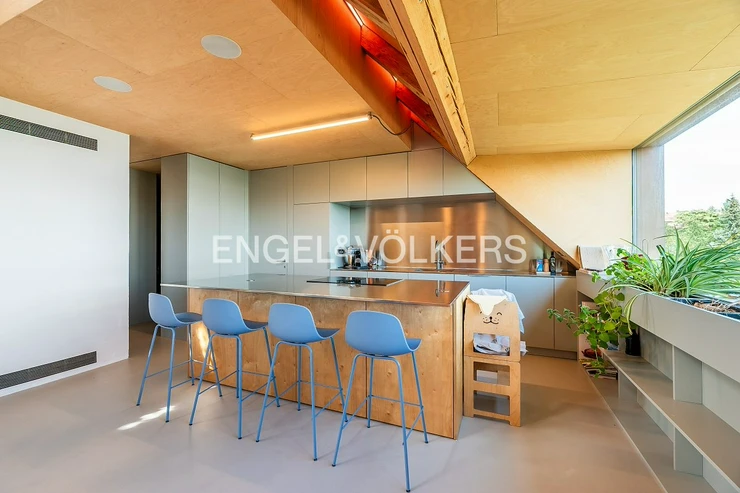 The apartment is equipped with built-in wardrobes, custom-made furniture, electrically controlled window blinds, central floor heating, premium Grohe fixtures, a washing machine, dryer, and high-quality Siemens kitchen appliances. It also includes a cellar and the possibility of using a shared charging station for electric cars.
