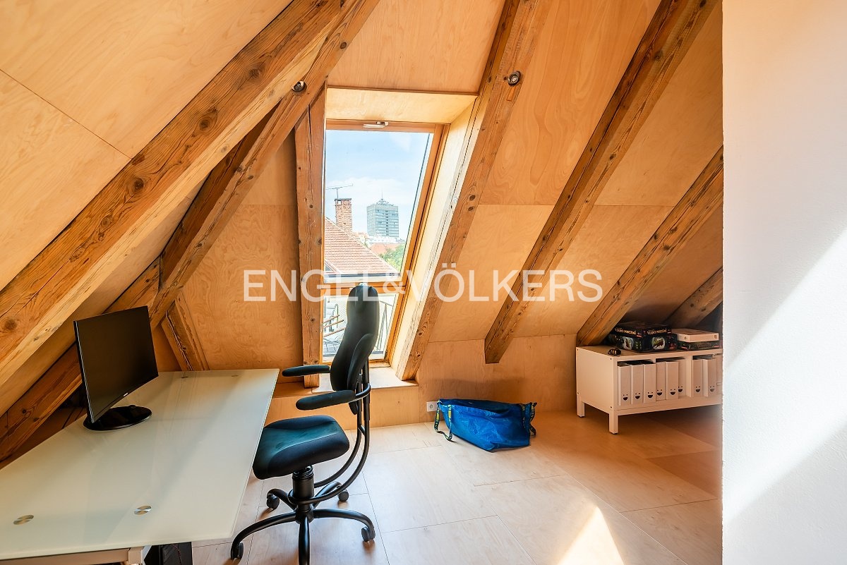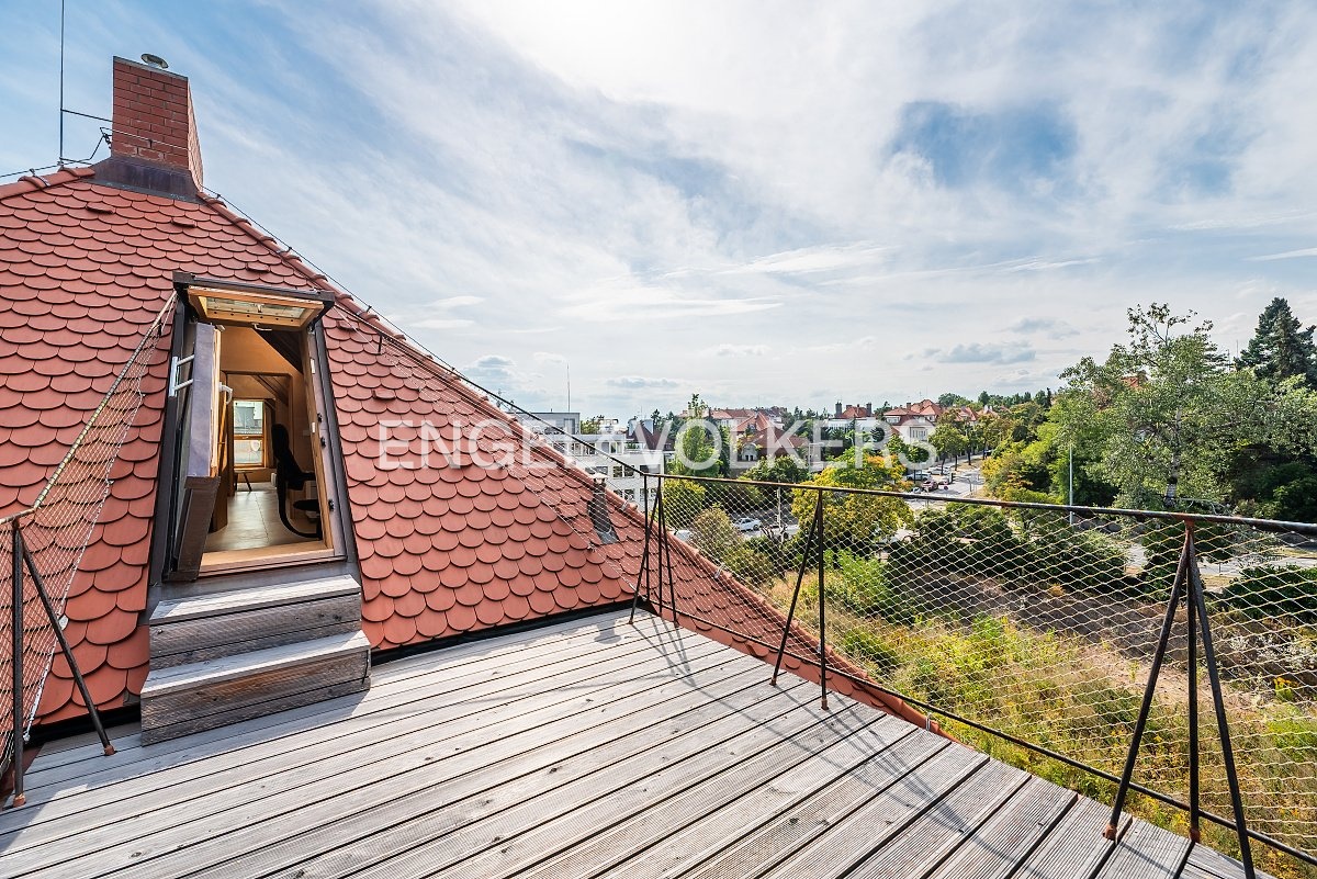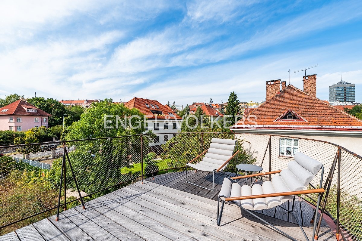 The apartment is located on the 3rd floor of a completely renovated villa with parking and a large shared garden, which includes a sauna, home office space, outdoor kitchen, fireplace, and playground. The location offers quick connections to the city centre, full civic amenities, and is within walking distance of the Želivského and Flora metro stations and the Atrium Flora shopping centre.