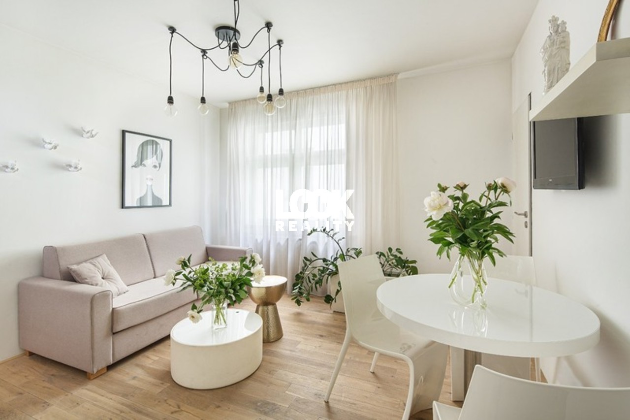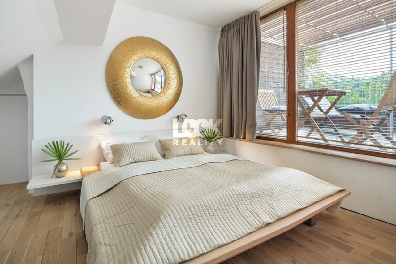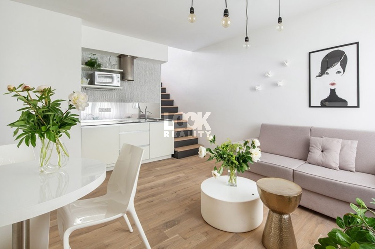 Luxurious bright duplex apartment with a terrace near the metro station Andel. We offer for rent a luxury duplex 2+kk with a size of 55 m2, which is located on the 5th floor of a building with an elevator (only to the 3rd floor) in Holeckova street. The apartment is rented fully furnished and consists of: ground floor - a fully equipped kitchen with a dishwasher, a bathroom, a dressing room and a living area, first floor - there is a bedroom with an entrance to the terrace. In the bathroom there is a shower and a toilet. The apartment has air conditioning. TV/SAT/WIFI. Internet is available, cleaning once a week. There is also a reception desk. Possibility of rent a garage for a fee. Not far away is the lookout tower Petrin, the Kinsky garden, nice places for a walk and relax. Complete civic amenities in the vicinity: restaurant, post office, medical facility, shopping center Novy Smichov. Nearby is the tram stop U Zvonu, the Andel metro station is about a 5-minute drive away. Pleasant living. We recommend. Possibility of short-term rental. The price for short term rental could be changed. Available from 2. 01. 2026.