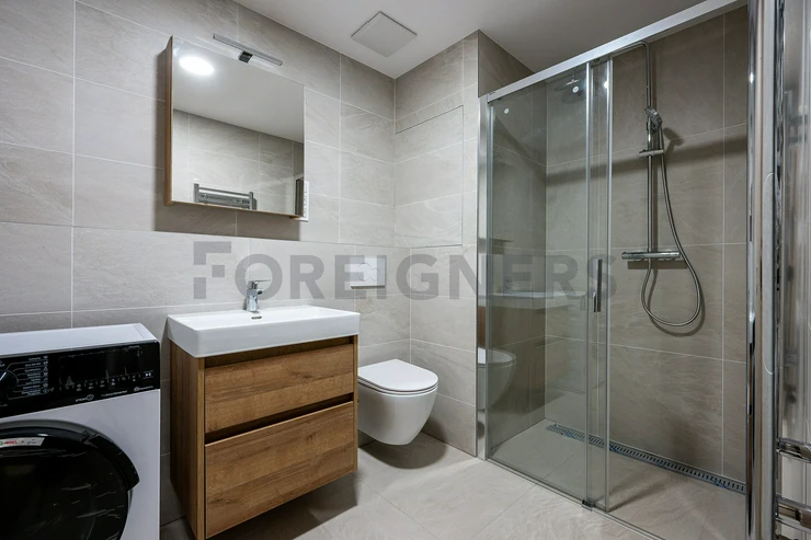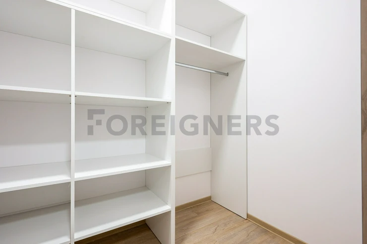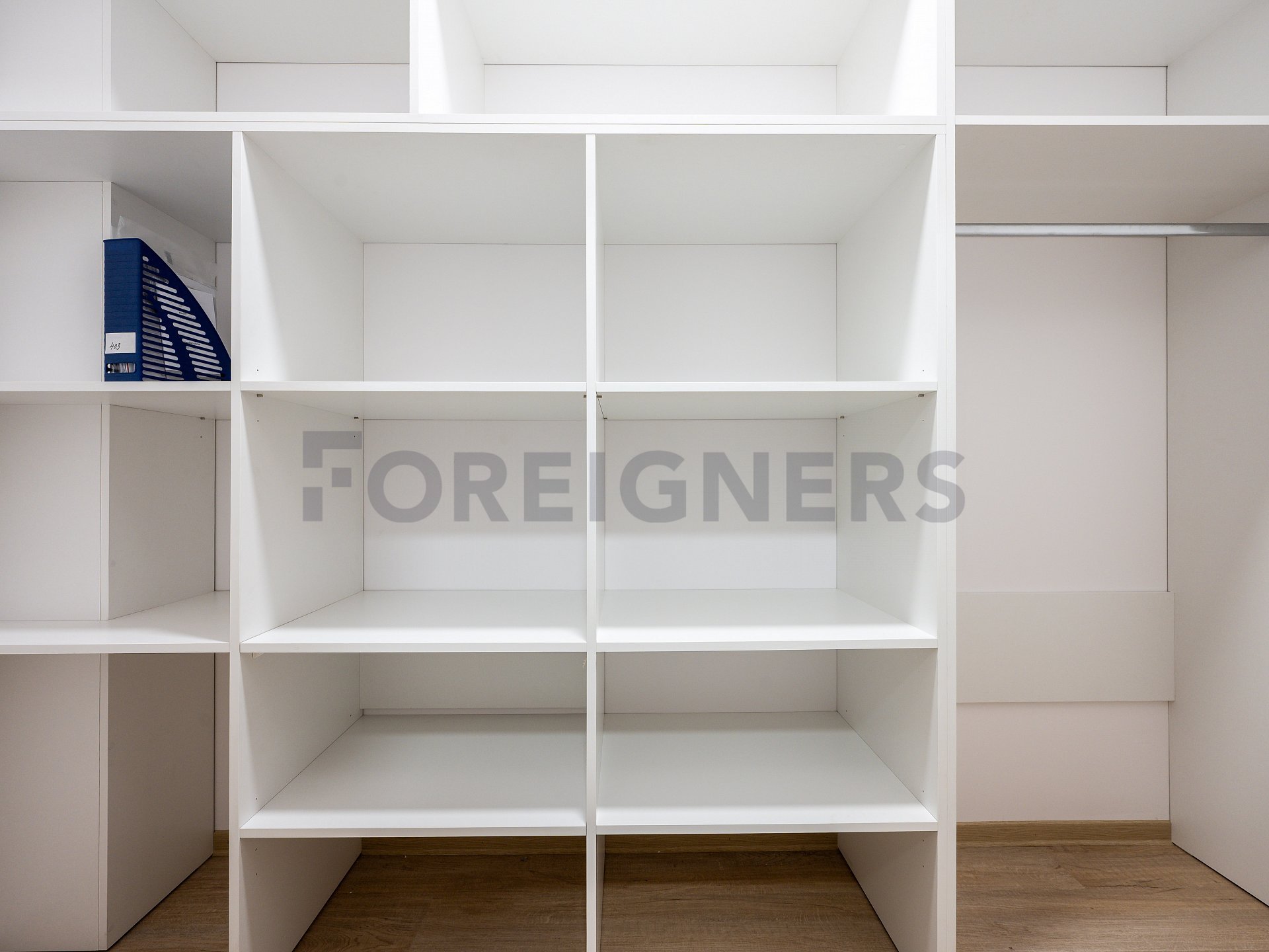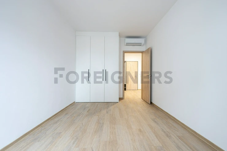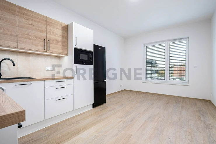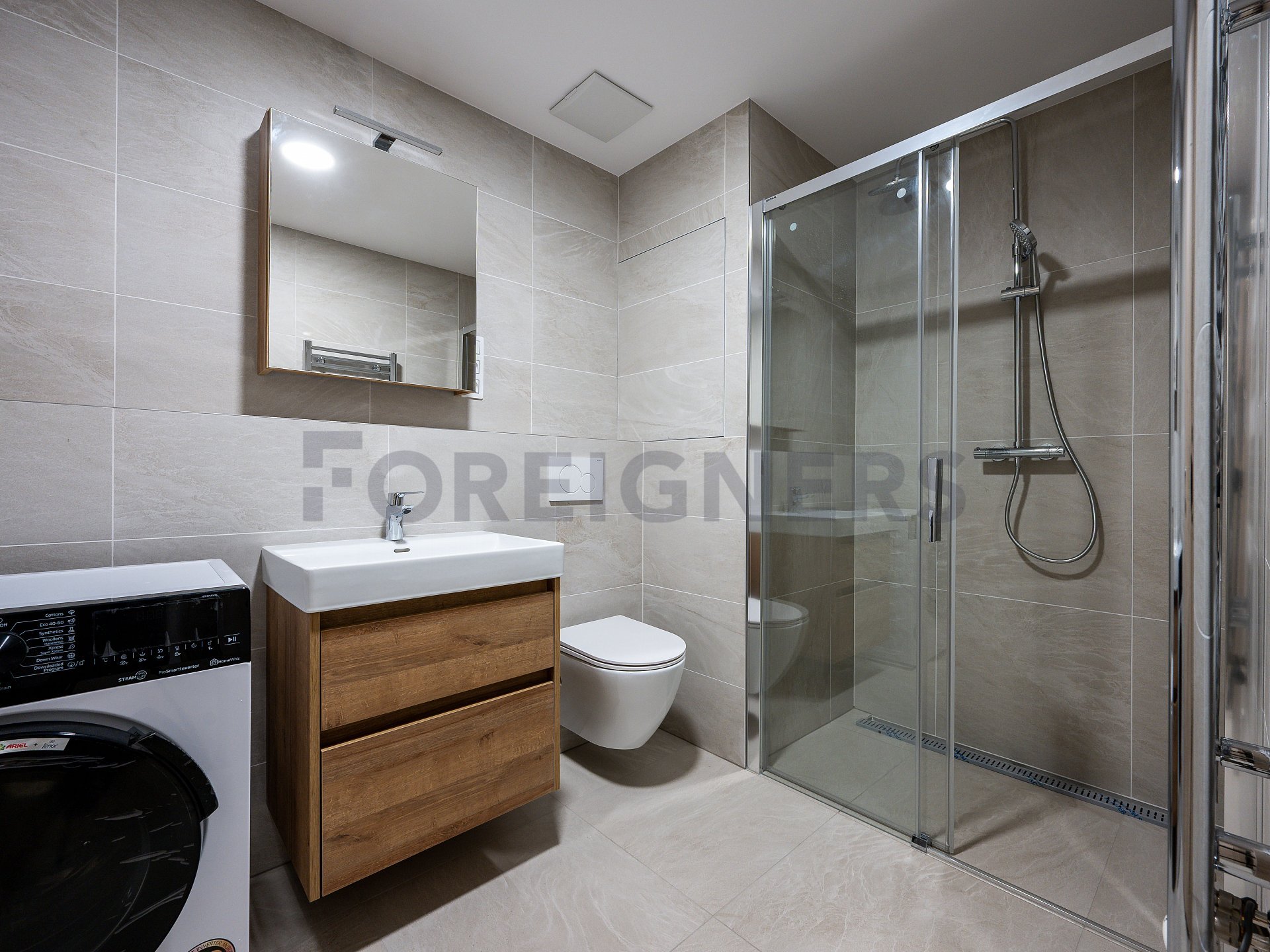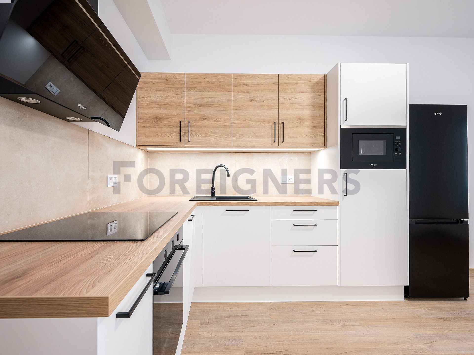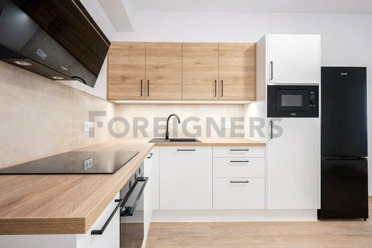 The apartment is partly furnished and offers modern amenities for comfortable living. The hallway is equipped with a shoe cabinet and a coat rack. The kitchen is equipped with built-in appliances – an oven, dishwasher, and microwave, while the refrigerator is freestanding.