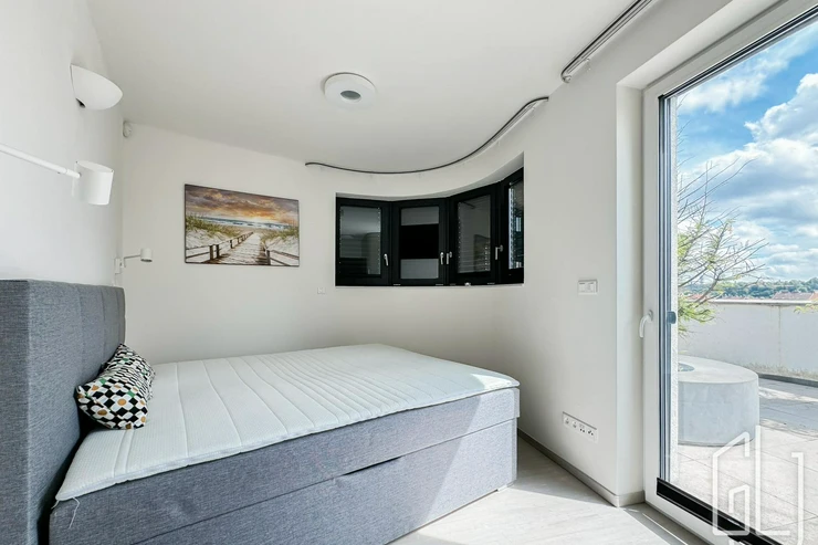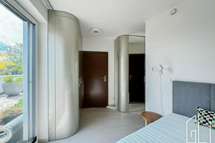 Ložnice je prostorná, vybavená manželskou postelí, dvěma velkými vestavěnými skříněmi a má přímý vstup na terasu, která nabízí klidné posezení s výhledem do zeleně.