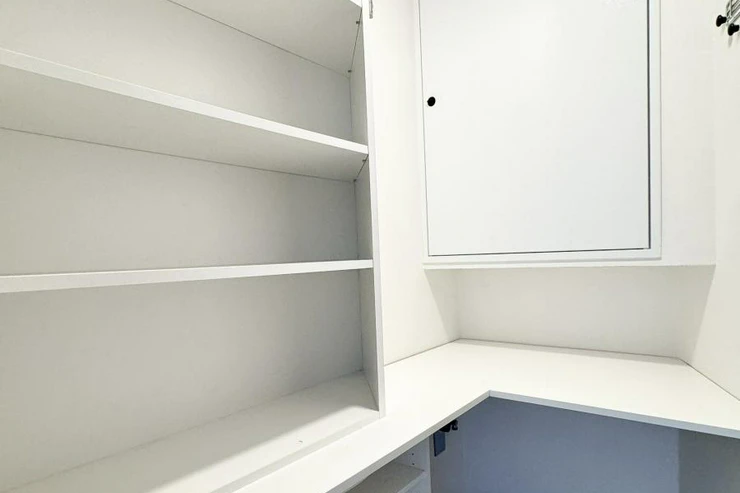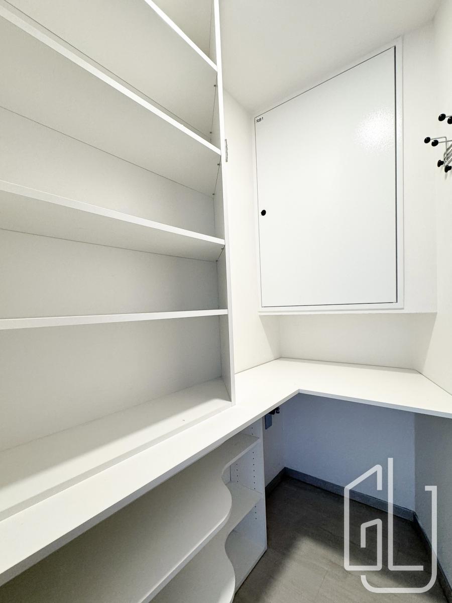 Součástí bytu je také komora s regály a pračkou a vestavěná skříň v předsíni pro další úložné prostory.