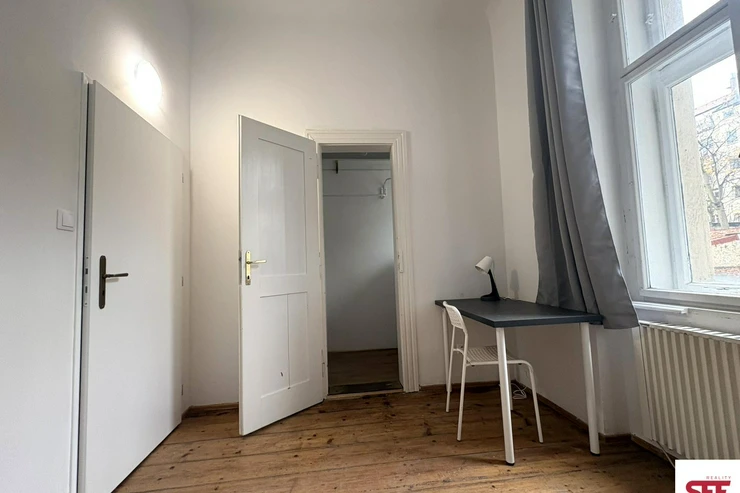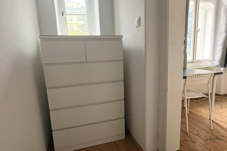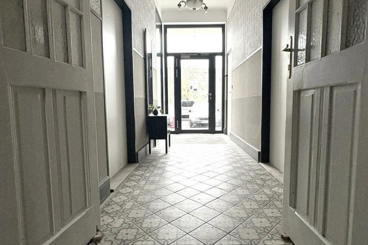 The apartment is situated in a well-maintained historic building without an elevator. It has a total of three rooms and is intended for a maximum of 4 tenants, taking into account the shared bathroom and separate toilet.