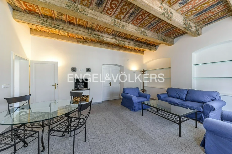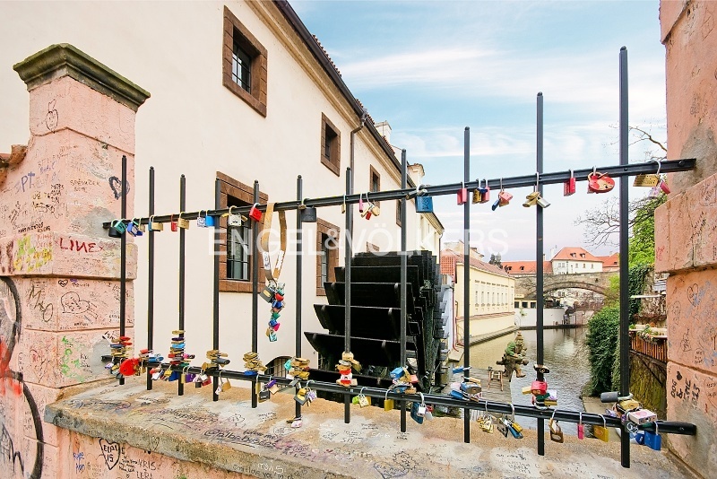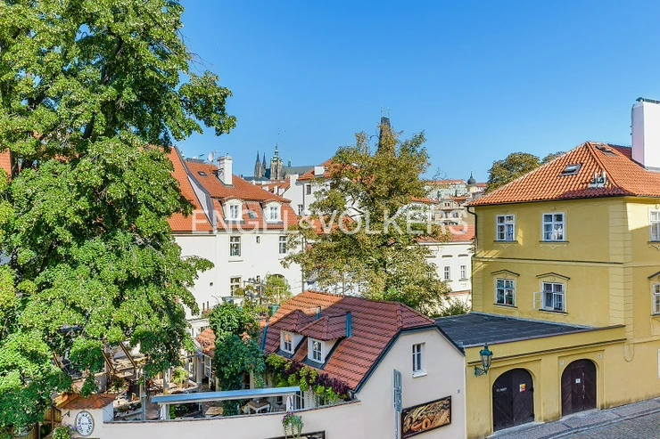 A fully furnished apartment in a historic apartment building located directly on Kampa is ready for immediate rent. The house has been renovated, while the architectural and decorative elements have been preserved. The living room is dominated by a wooden painted ceiling and a functional fireplace, which in conjunction with the views of Prague Castle evokes a unique atmosphere. The kitchen has all appliances and the utility room offers a washing machine and dryer. The master bedroom with private bathroom faces the quiet courtyard. The second bedroom has a bathroom with shower accessible from the hallway. Great location in the heart of the Lesser Town combines excellent transport accessibility with fantastic leisure activities.
