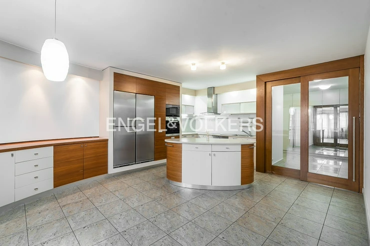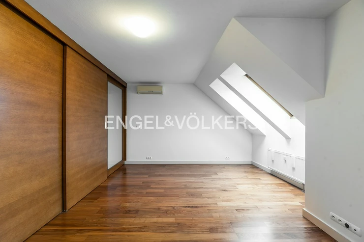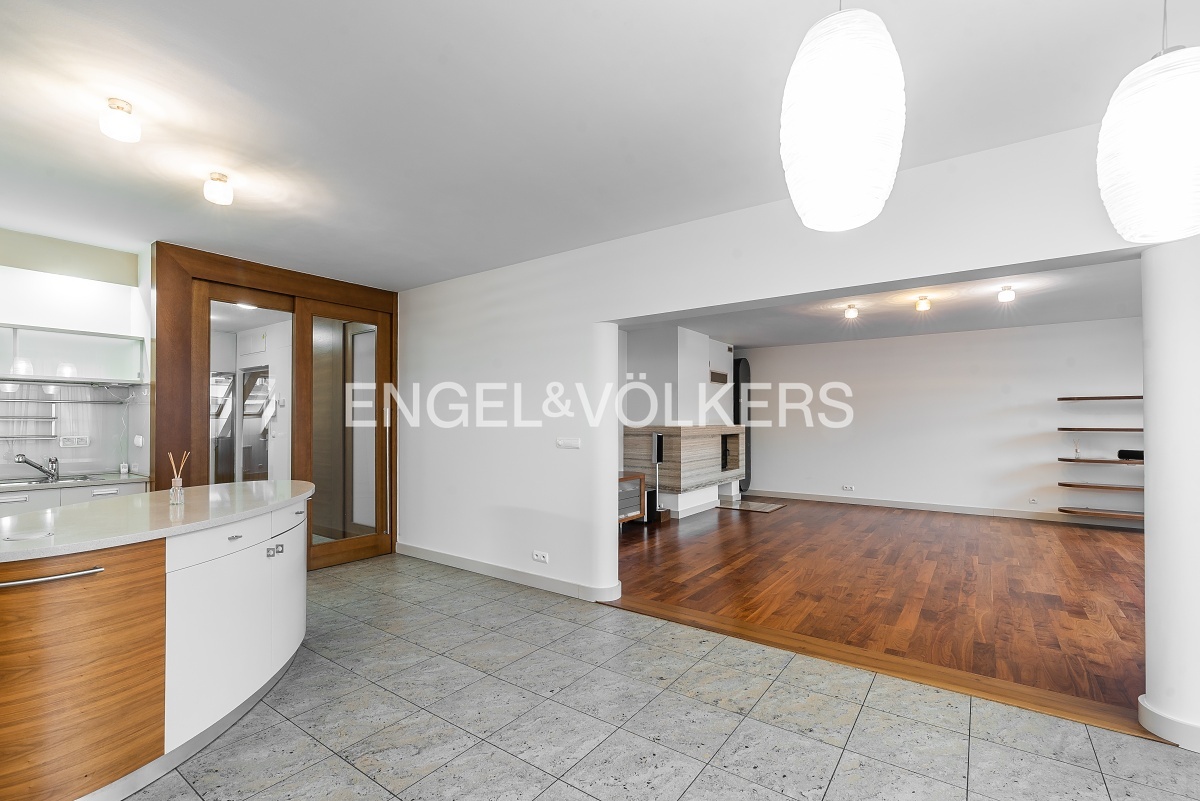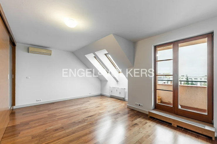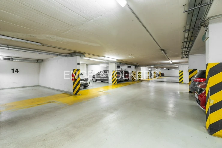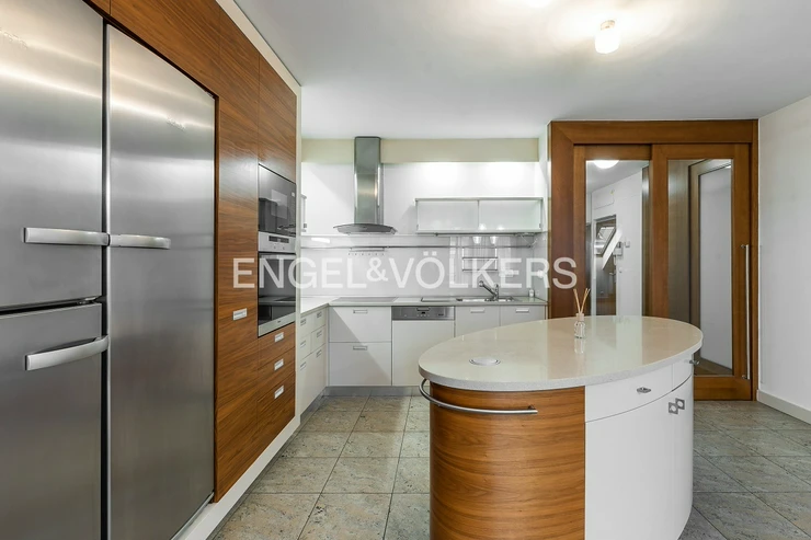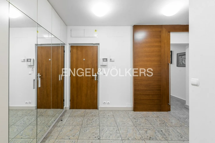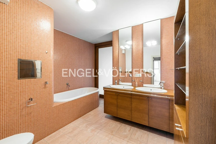 The heart of the apartment is a spacious living room with a fireplace, connected to a fully equipped kitchen with a balcony facing the courtyard. The apartment further consists of three separate bedrooms and two bathrooms. The larger bathroom is directly accessible from the master bedroom and has a bathtub. The smaller bathroom is equipped with a shower and an automatic washing machine. There are spacious built-in wardrobes and air conditioning units throughout the apartment.