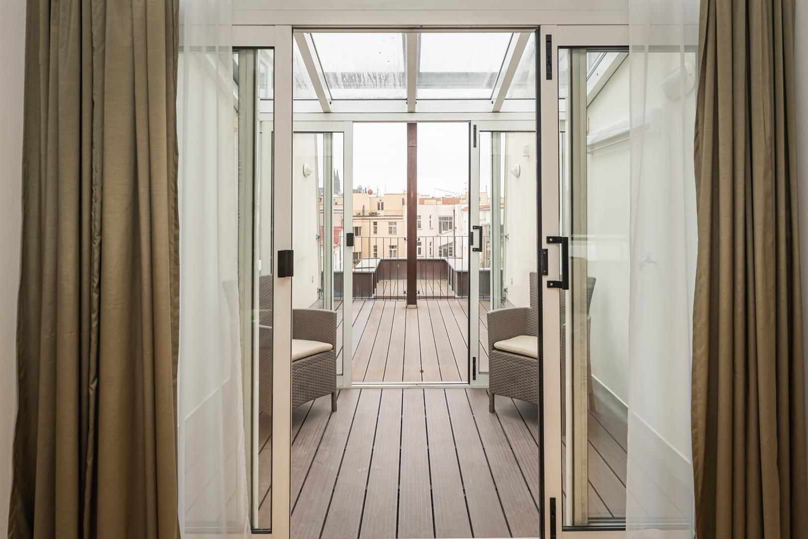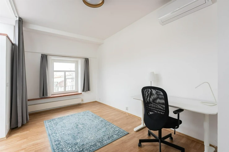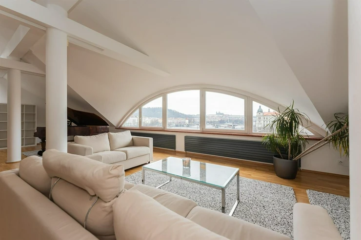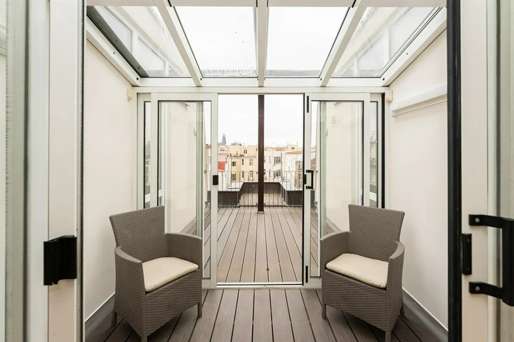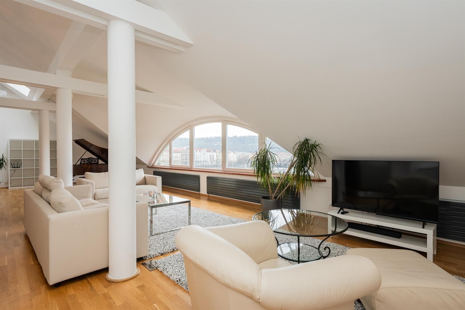 A luxury spacious duplex with a terrace and a winter garden, 5+kk (4 bedrooms, 3 bathrooms) with a total area of 248 m2, is situated on the 6th and 7th floors of a residential building with an elevator. The apartment offers a living room with a fully equipped kitchen (stove/oven, refrigerator, dishwasher) separated by a glass partition, 4 bedrooms located in the quiet inner block zone, 3 bathrooms (shower, bathtub, bidet), 2 dressing rooms, a storage room, and a laundry room. The apartment is furnished. The terrace and winter garden are located on the south side. Beautiful view of Hradčany. SAT, telephone line, and internet.