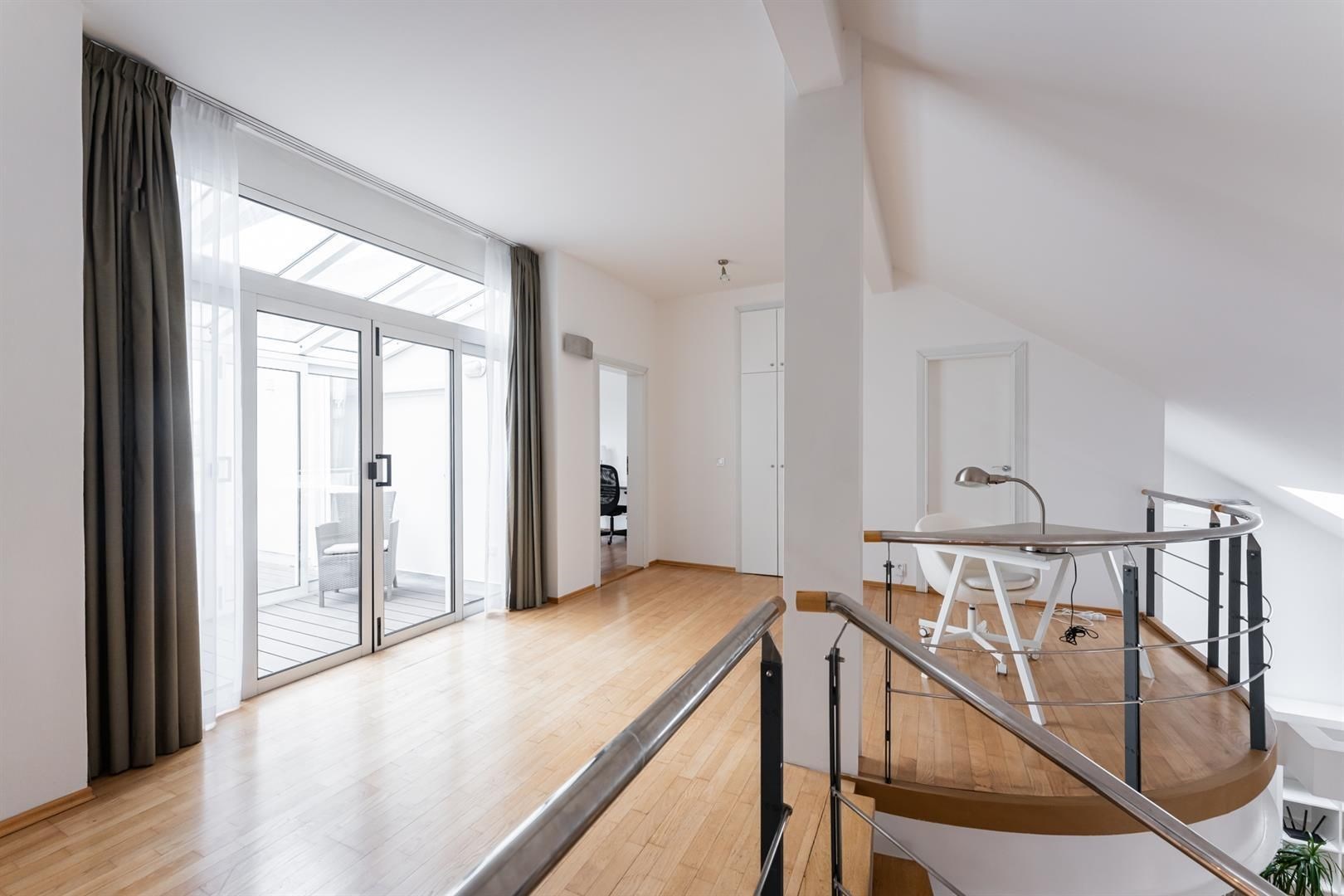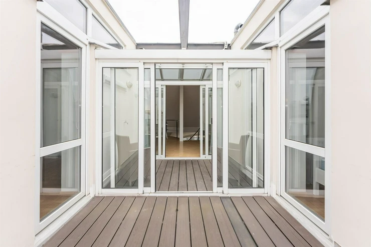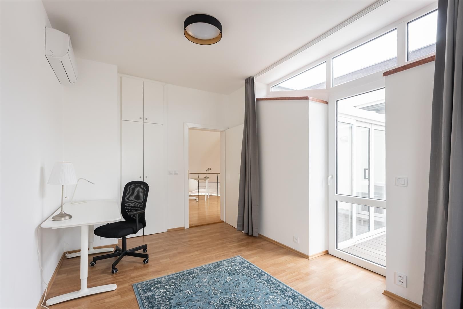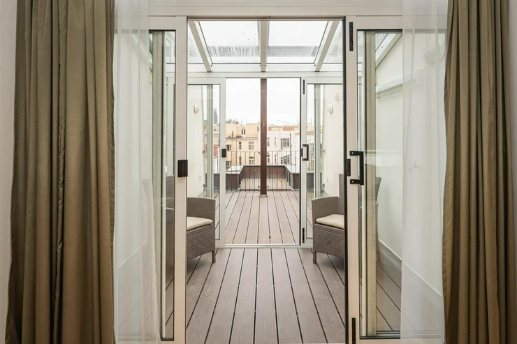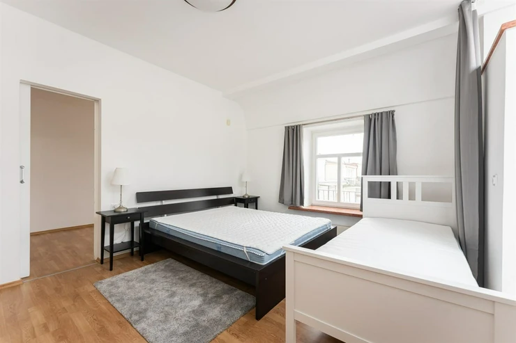 A luxury spacious duplex with a terrace and a winter garden, 5+kk (4 bedrooms, 3 bathrooms) with a total area of 248 m2, is situated on the 6th and 7th floors of a residential building with an elevator. The apartment offers a living room with a fully equipped kitchen (stove/oven, refrigerator, dishwasher) separated by a glass partition, 4 bedrooms located in the quiet inner block zone, 3 bathrooms (shower, bathtub, bidet), 2 dressing rooms, a storage room, and a laundry room. The apartment is furnished. The terrace and winter garden are located on the south side. Beautiful view of Hradčany. SAT, telephone line, and internet.