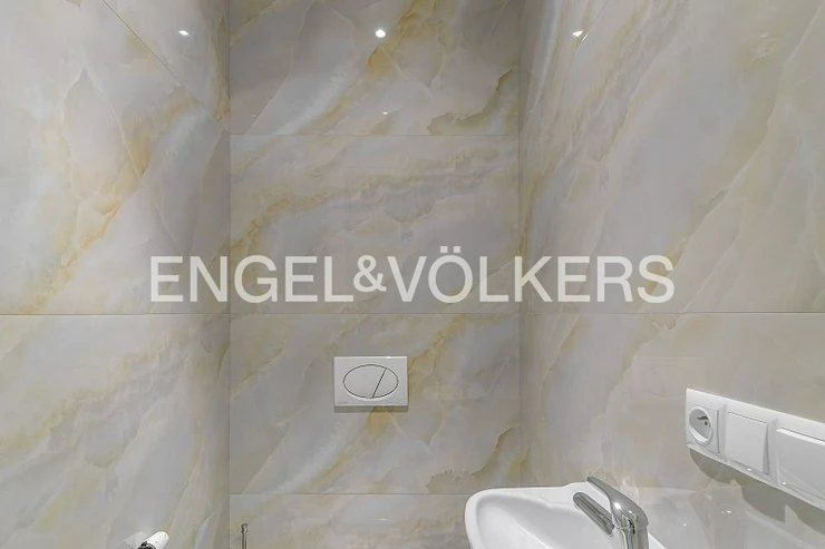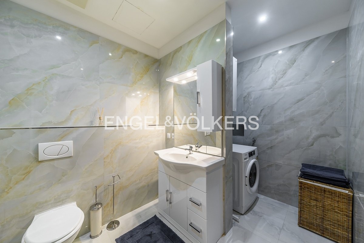 The apartment underwent a complete renovation in 2023, including new floors, bathrooms, windows and a kitchen, and has not been used since. The layout includes a spacious living room with a kitchenette and bedroom. Upon entering the apartment, you are greeted by a spacious hallway which leads to both main rooms. The living room is oriented to the northeast, while the bedroom faces southwest and offers a peaceful view of the courtyard. The bedroom has an en-suite bathroom and access to a balcony.