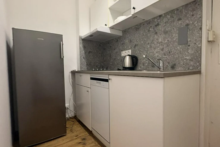 Shared kitchen with basic equipment: fridge, stovetop, extractor hood, dishwasher, microwave, electric kettle, basic dishes and utensils
