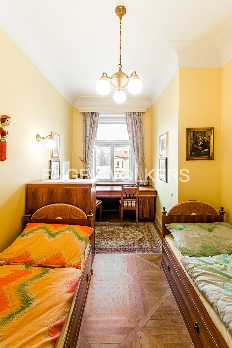 From the entrance hall, you enter a lounge with a historic stove, a guest toilet, and a bathroom with a utility room equipped with appliances (washer, dryer). Another dominant feature of the apartment is the fully equipped kitchen (Miele and Siemens appliances) with a dining area. Both bedrooms, one of which is a walk-through, have windows overlooking Prague Castle.