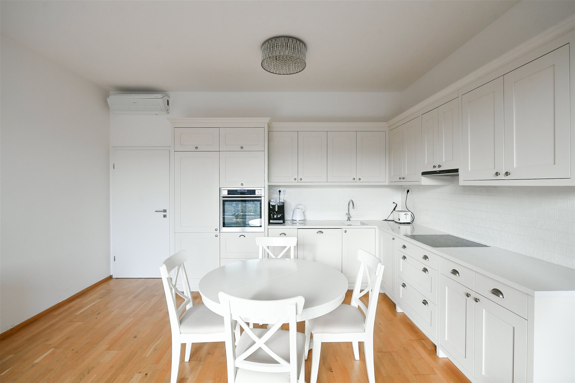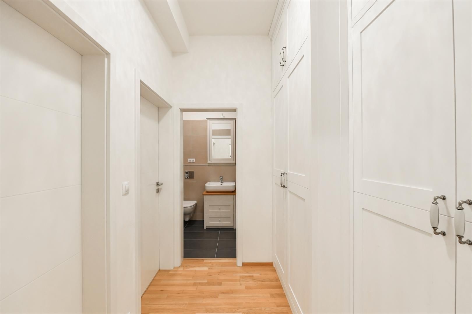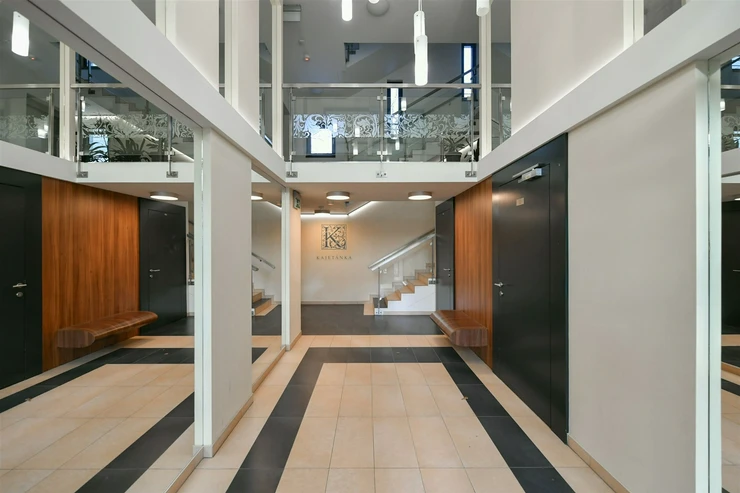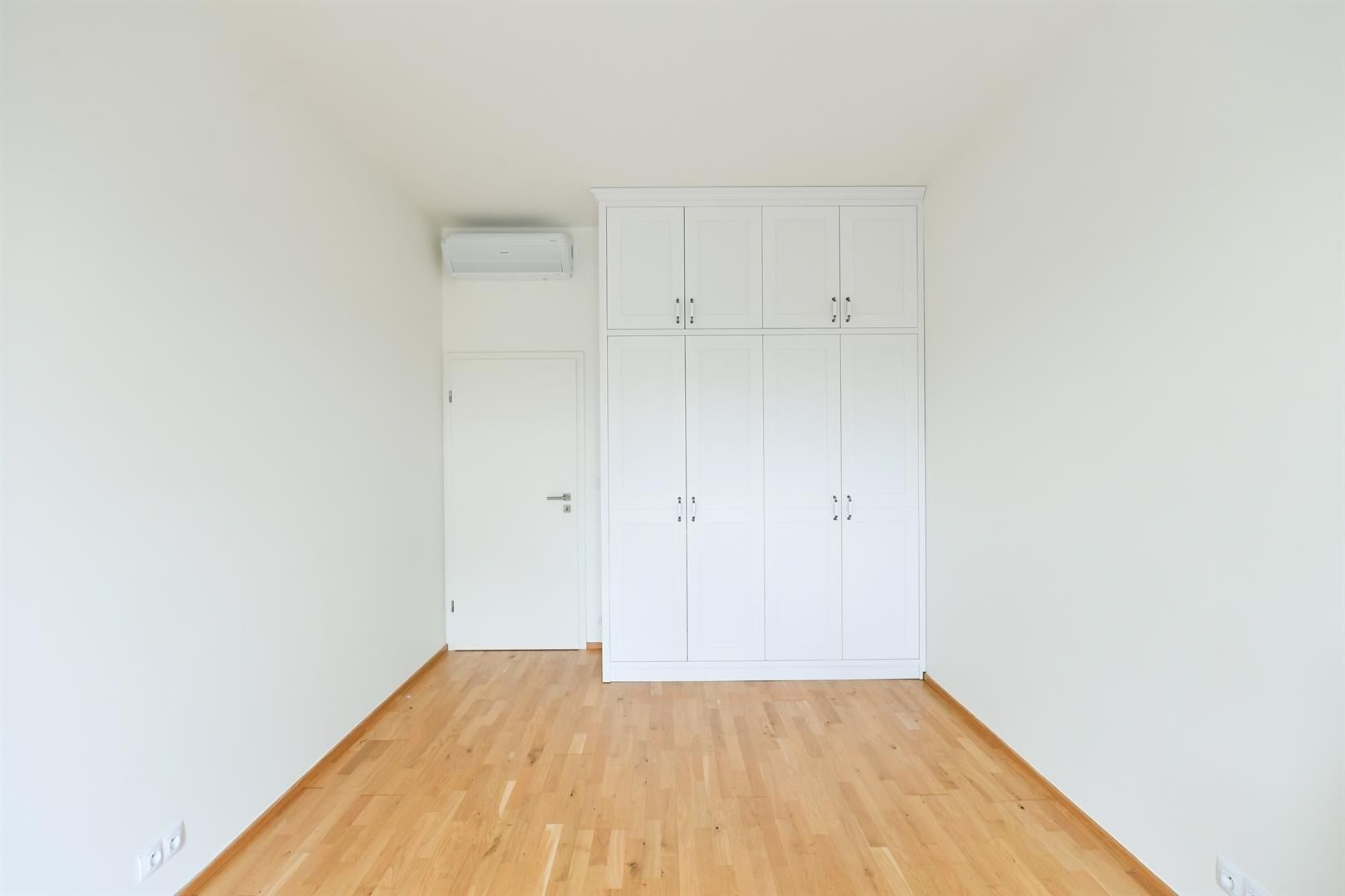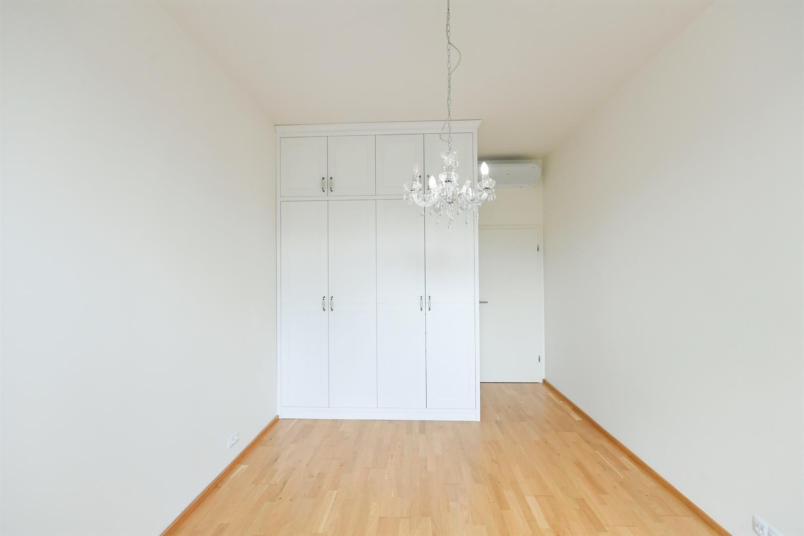 The interior consists of a living room with a kitchen and entrance to the terrace, two bedrooms, a bathroom with a bathtub and toilet, a separate second toilet, and a laundry room. Ample built-in storage space, high ceilings (293 cm), draft-free air conditioning, oak parquet floors, and high-quality remote-controlled blinds enhance the comfort of this apartment. The elevator goes directly to the floor and there is a large hallway in front of the apartment, shared with only 2 other apartments.