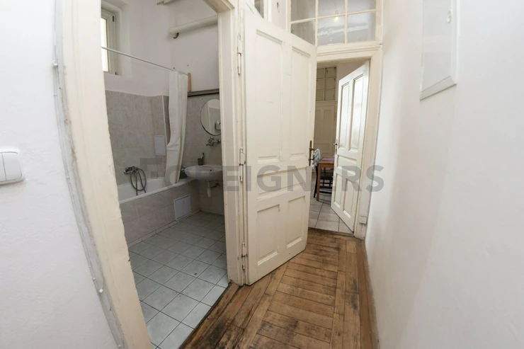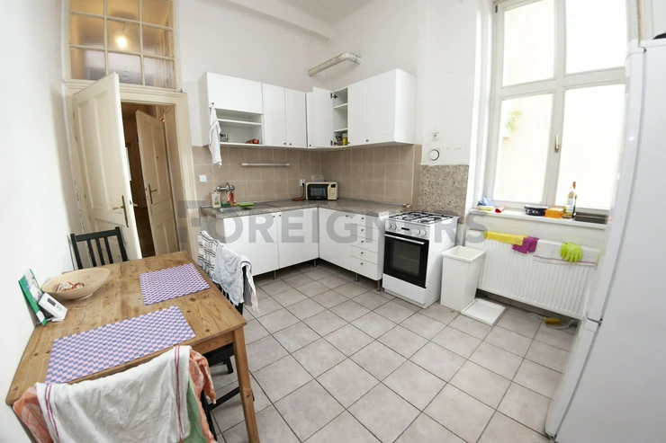 The apartment is fully furnished. The bathroom has a bathtub and washing machine. The toilet is separate. The kitchen is equipped with all electric appliances (two fridges with freezer, oven, gas stove, microwave) dinner table and chairs. The room is furnished with two beds, two desks, chairs and a wardrobe.