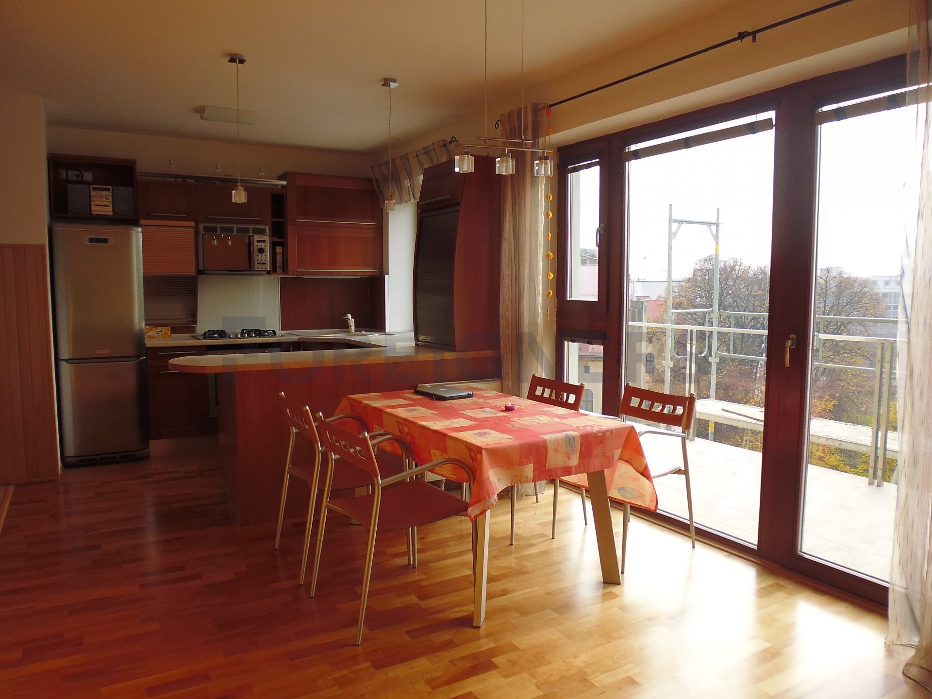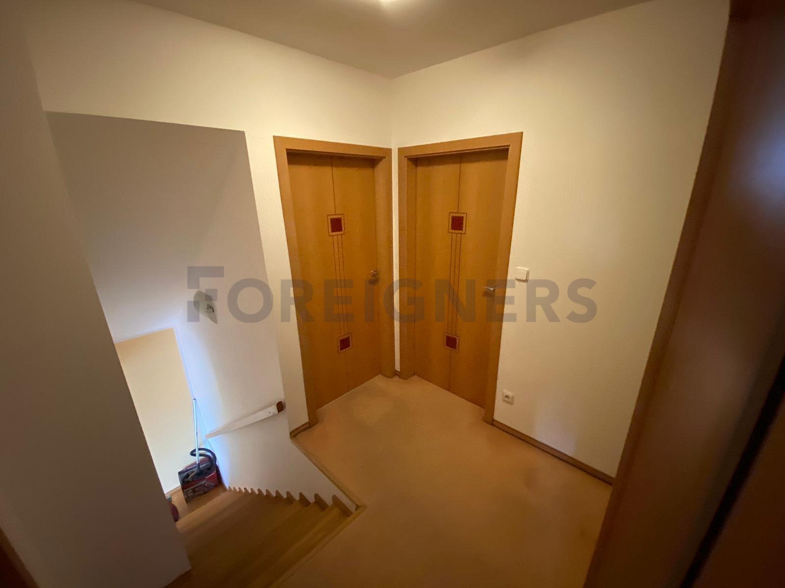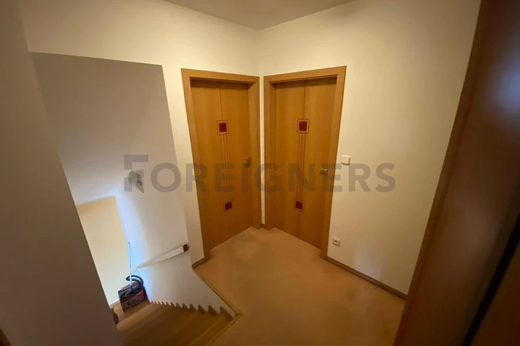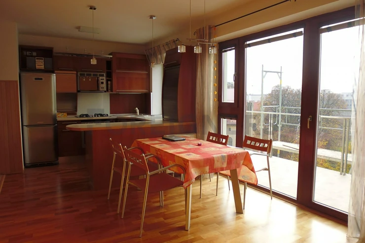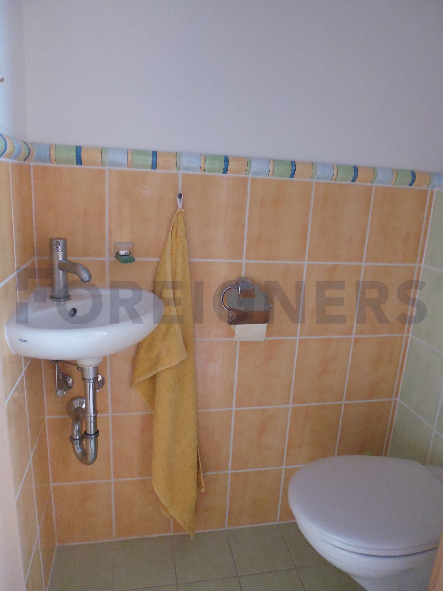 The apartment is offered fully furnished and divided into 2 floors. On the first floor is a kitchen area with devices, a dining table with chairs together with a living space, a separate toilet, a storage place and a balcony.