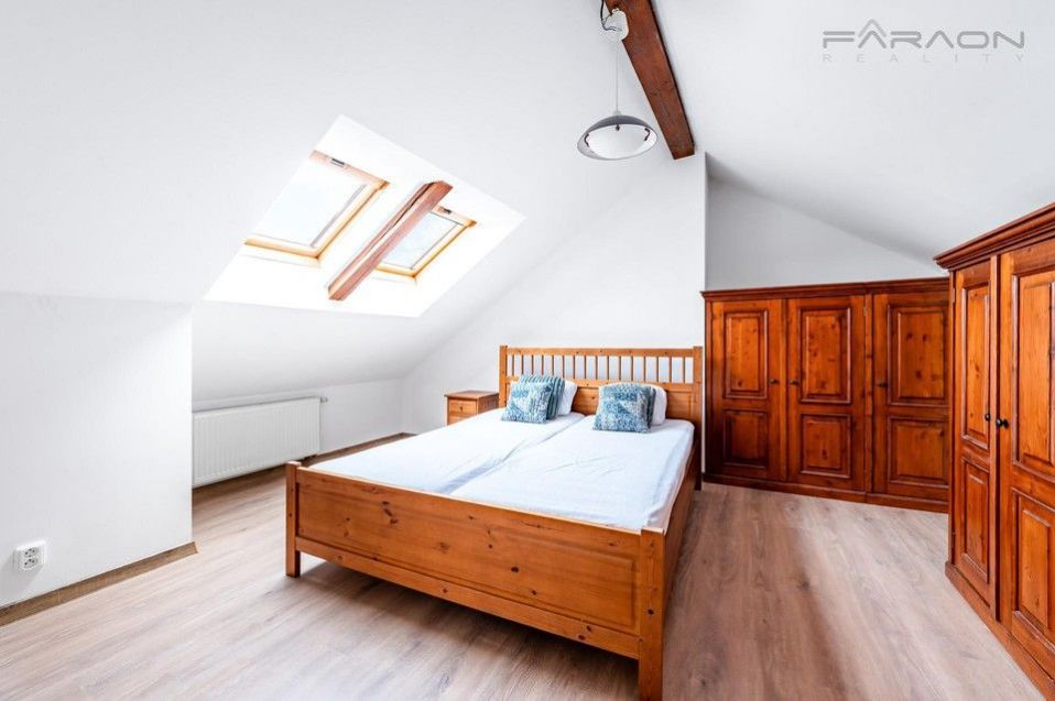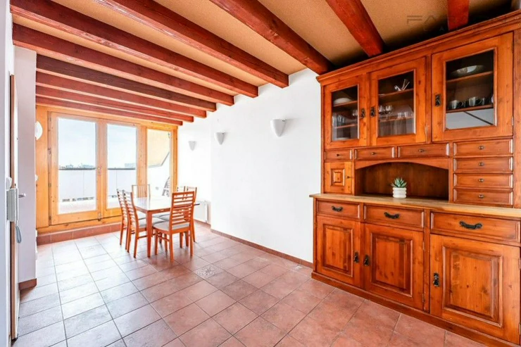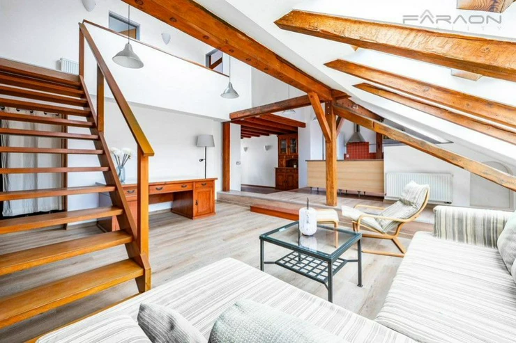 The apartment is rented furnished, see photos. The kitchen is equipped with dishes and all appliances - dishwasher, ceramic hob, oven, extractor hood, refrigerator. The bedroom has a double bed, the second room can be used as a bedroom, dressing room or study. The apartment has plenty of storage space. Custom-made furniture, made of solid exotic wood, appropriately complements the atmosphere of the acknowledged carved beams in the interior, with a wooden staircase.