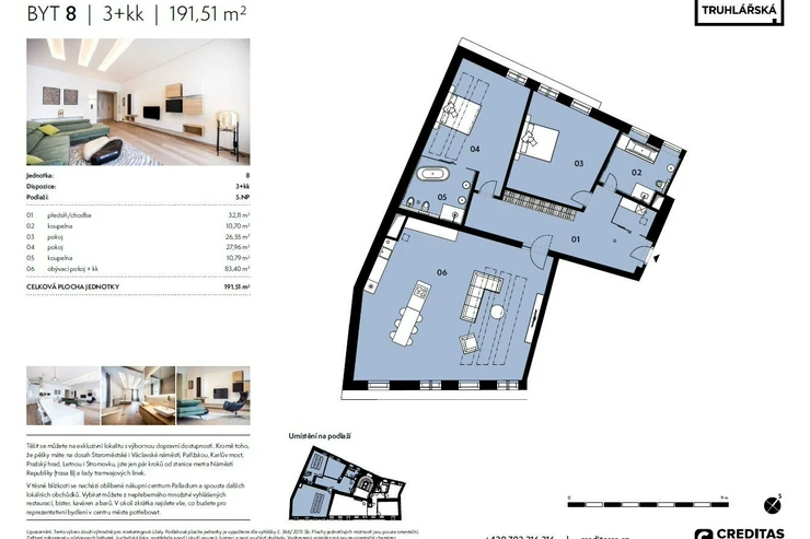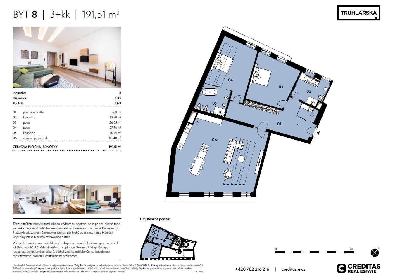 From the direct owner, we offer premium rental housing in Prague 1 on Truhlářská Street. The 3+kk apartment with a size of 192 m2 is located on the 5th floor of a renovated building with an elevator. The interior design was handled by the renowned architectural studio de.fakto, with an emphasis on functionality and design. The main feature of the apartment is a spacious and bright living room, thanks to numerous windows, connected to a fully equipped kitchen and dining area. Additionally, this generously designed apartment features a master bedroom with a fully equipped en-suite bathroom with Preciosa products, a second bedroom, a dressing room, and a separate bathroom with a bathtub, shower, toilet, and bidet shower. The spacious entrance hall hides built-in wardrobes that provide elegantly designed storage spaces. The comfort of the residence is enhanced by a ceiling cooling and heating system, as well as high-speed internet.