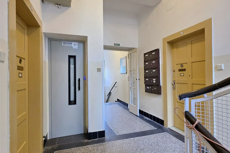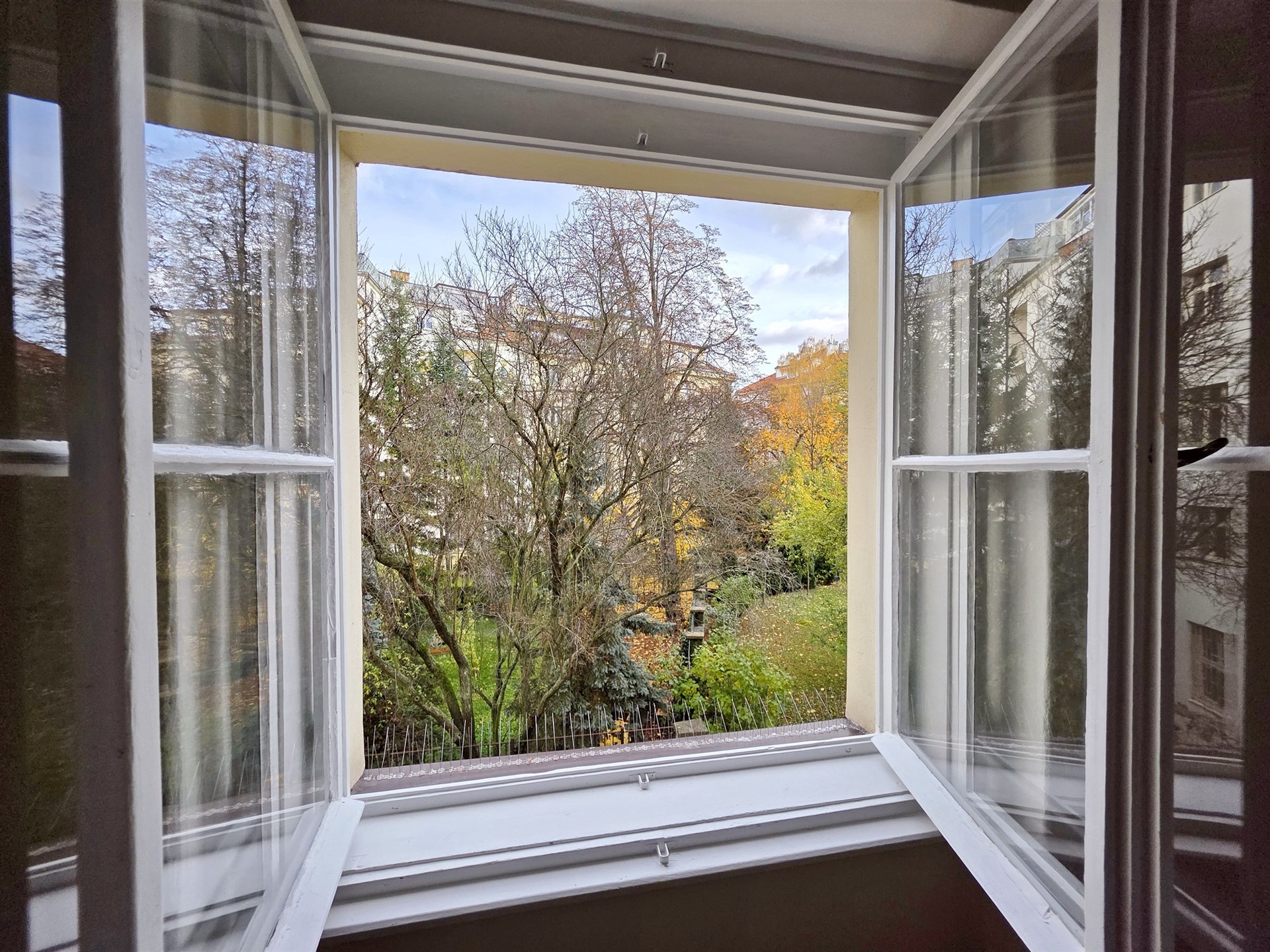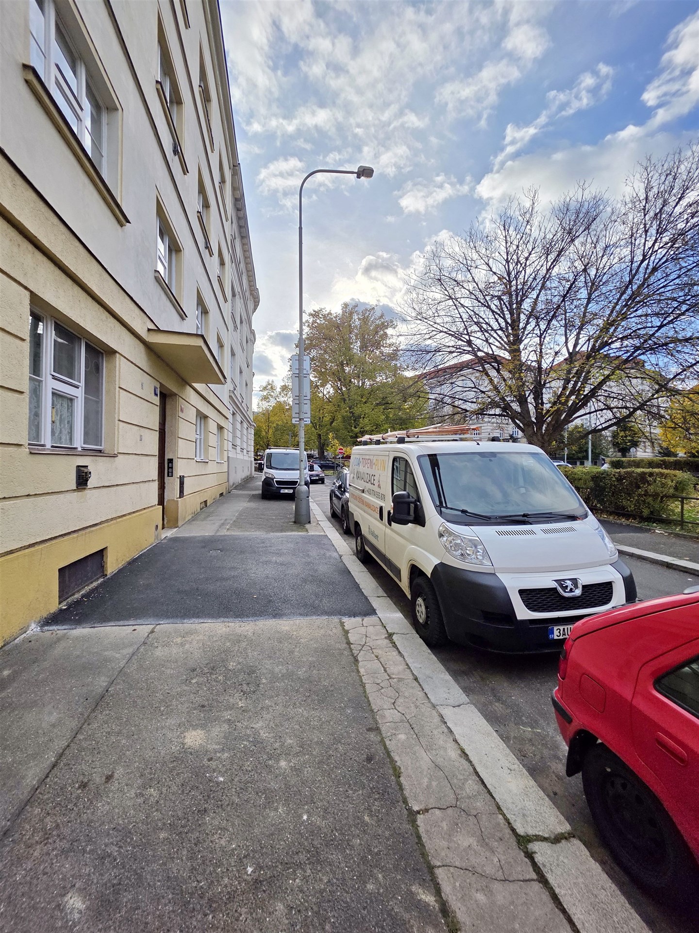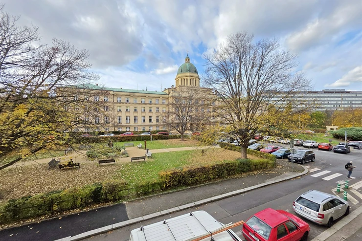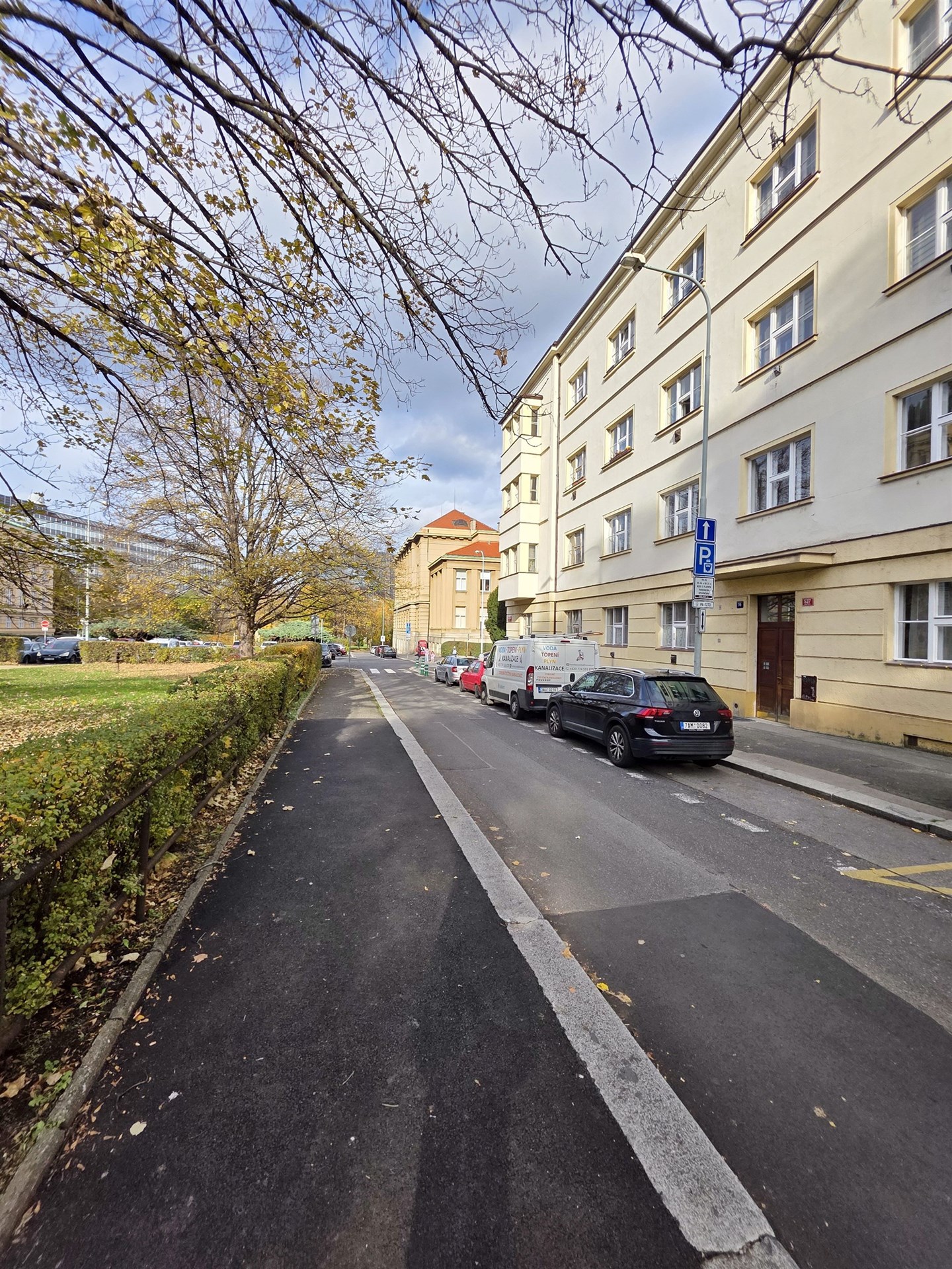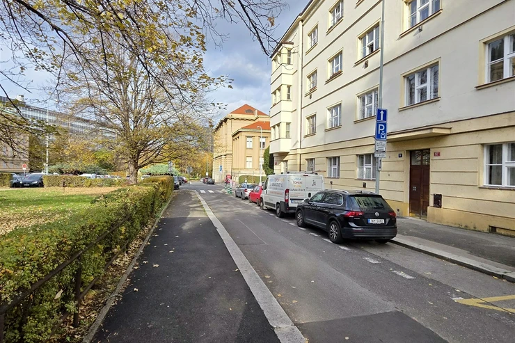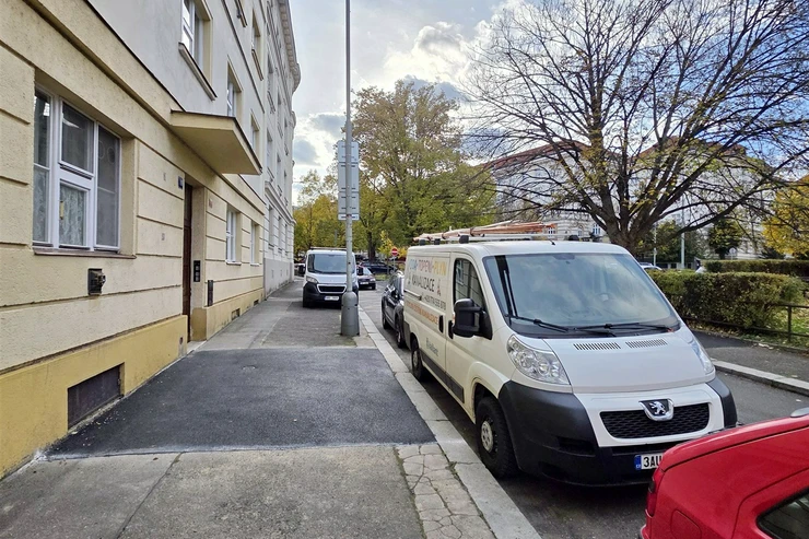 The apartment is on the first floor of a building with an elevator. The view from the apartment is oriented towards the west and east, indicating that the space is beautifully lit throughout the day. Parking is possible directly on the street in front of the building, which is always a big plus in the densely built-up areas of Prague.