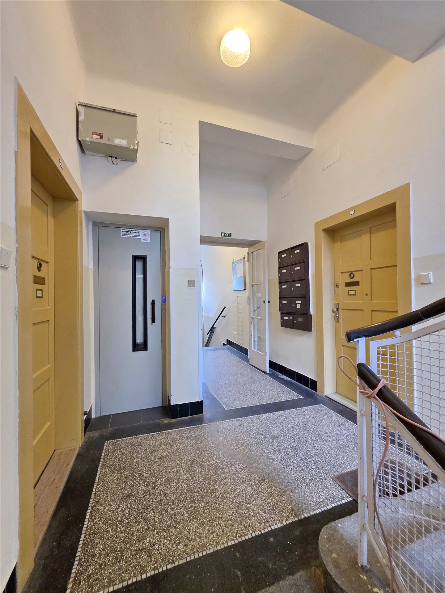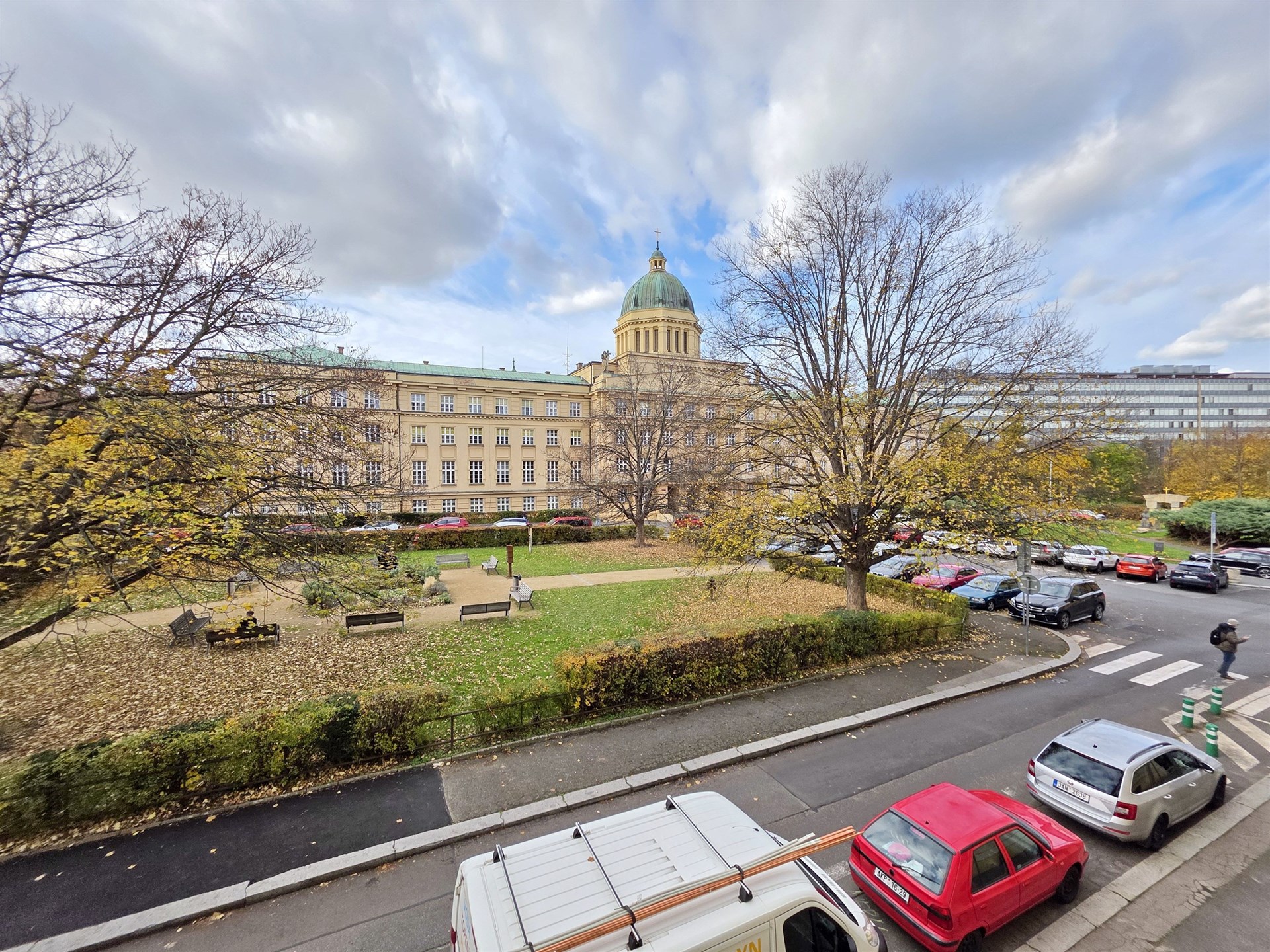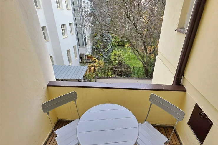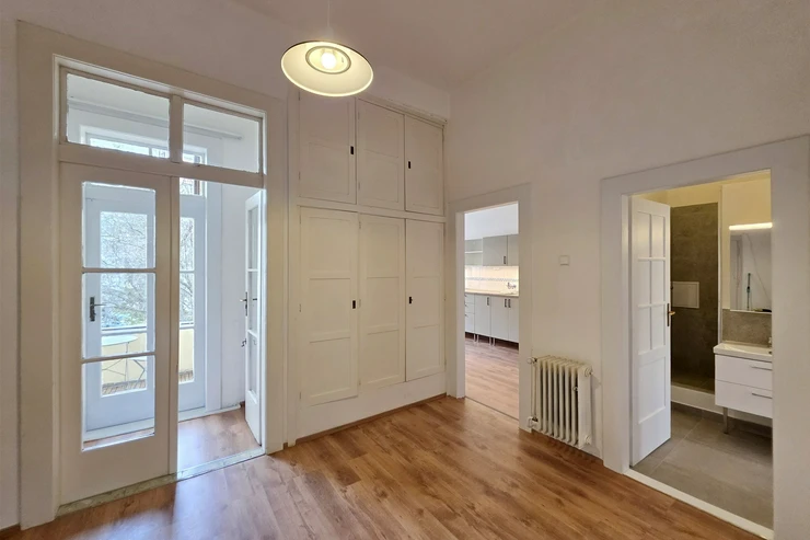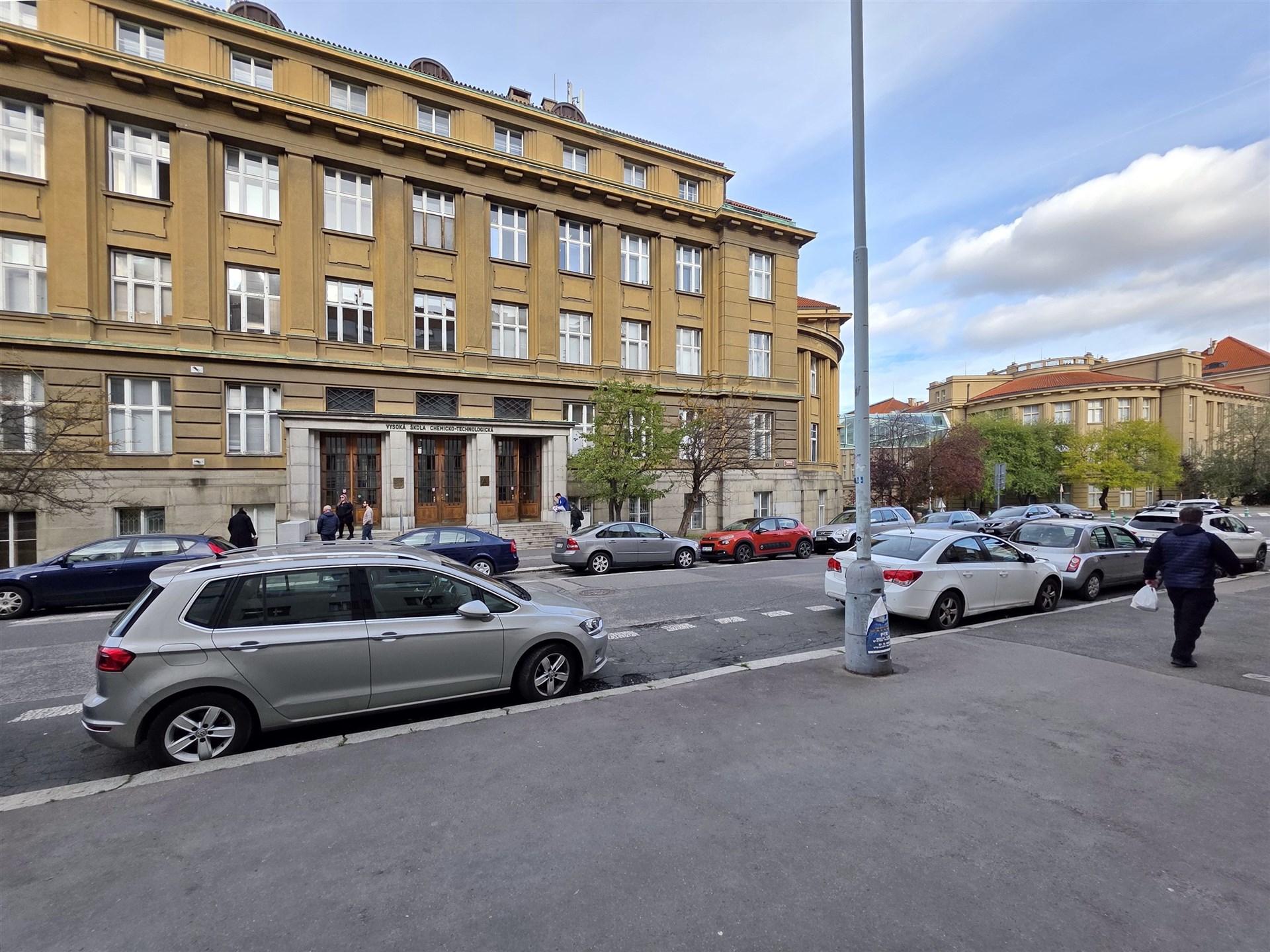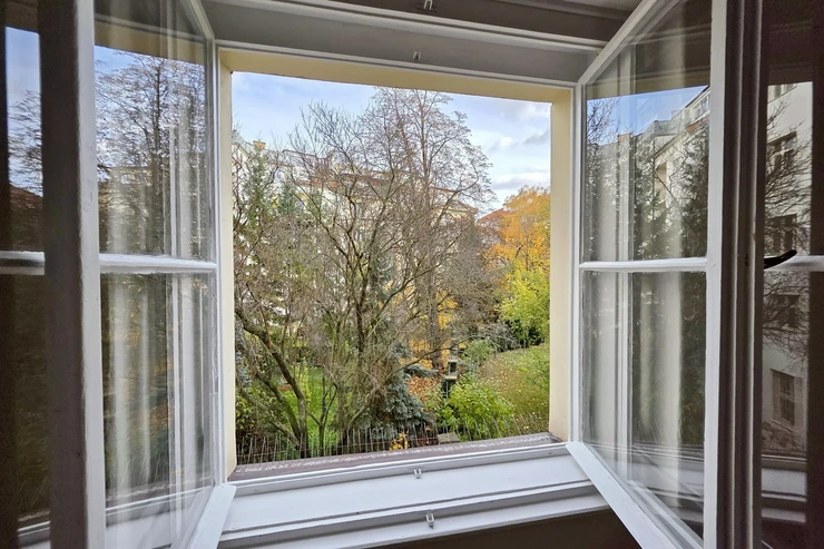 The apartment is on the first floor of a building with an elevator. The view from the apartment is oriented towards the west and east, indicating that the space is beautifully lit throughout the day. Parking is possible directly on the street in front of the building, which is always a big plus in the densely built-up areas of Prague.