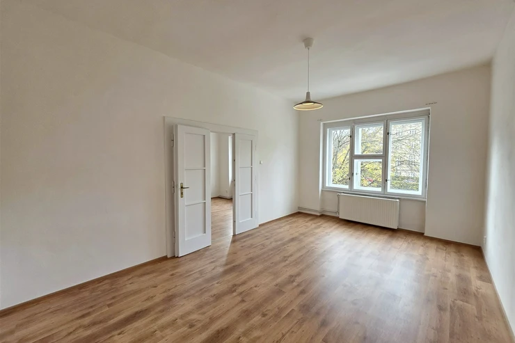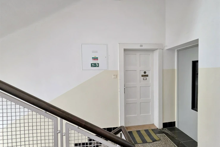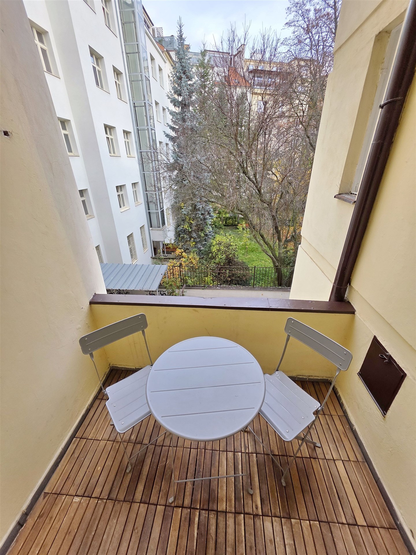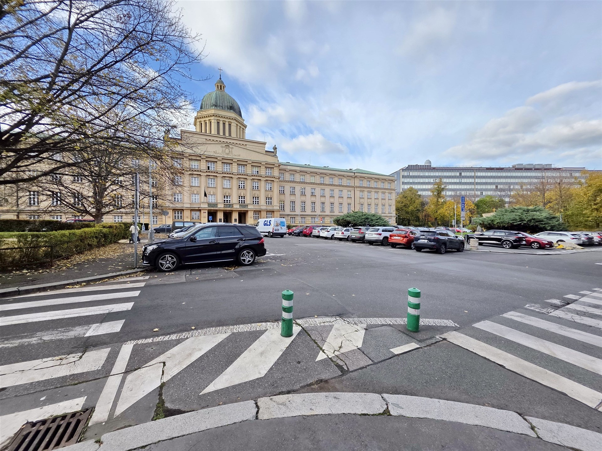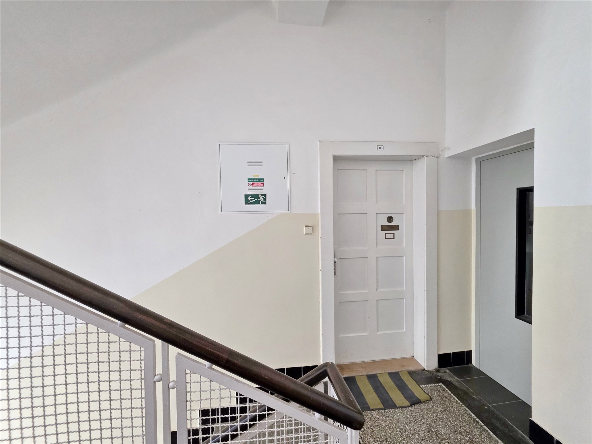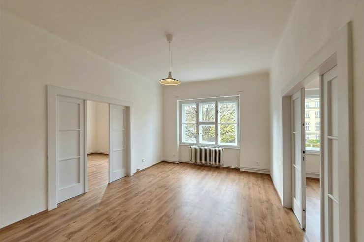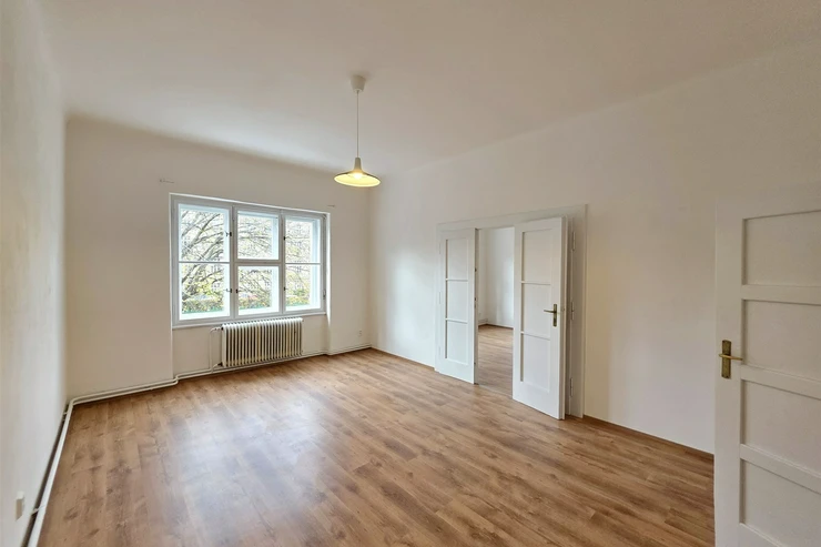 The apartment is on the first floor of a building with an elevator. The view from the apartment is oriented towards the west and east, indicating that the space is beautifully lit throughout the day. Parking is possible directly on the street in front of the building, which is always a big plus in the densely built-up areas of Prague.