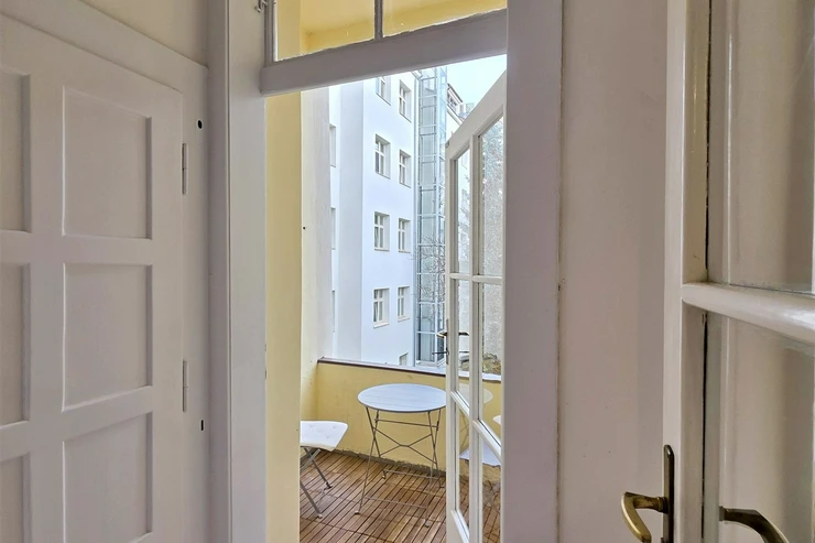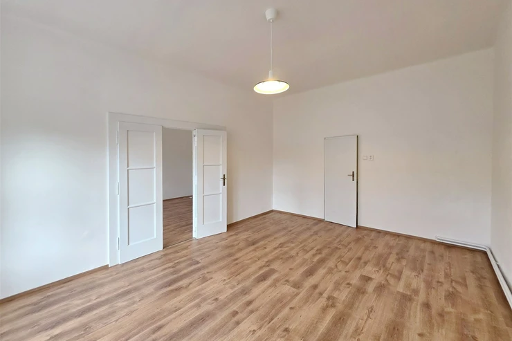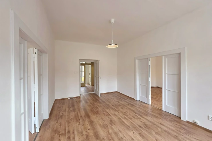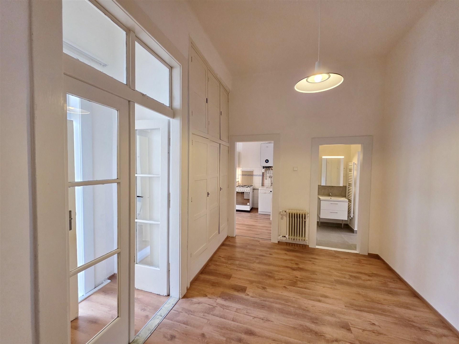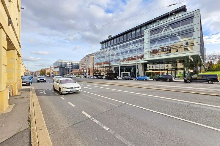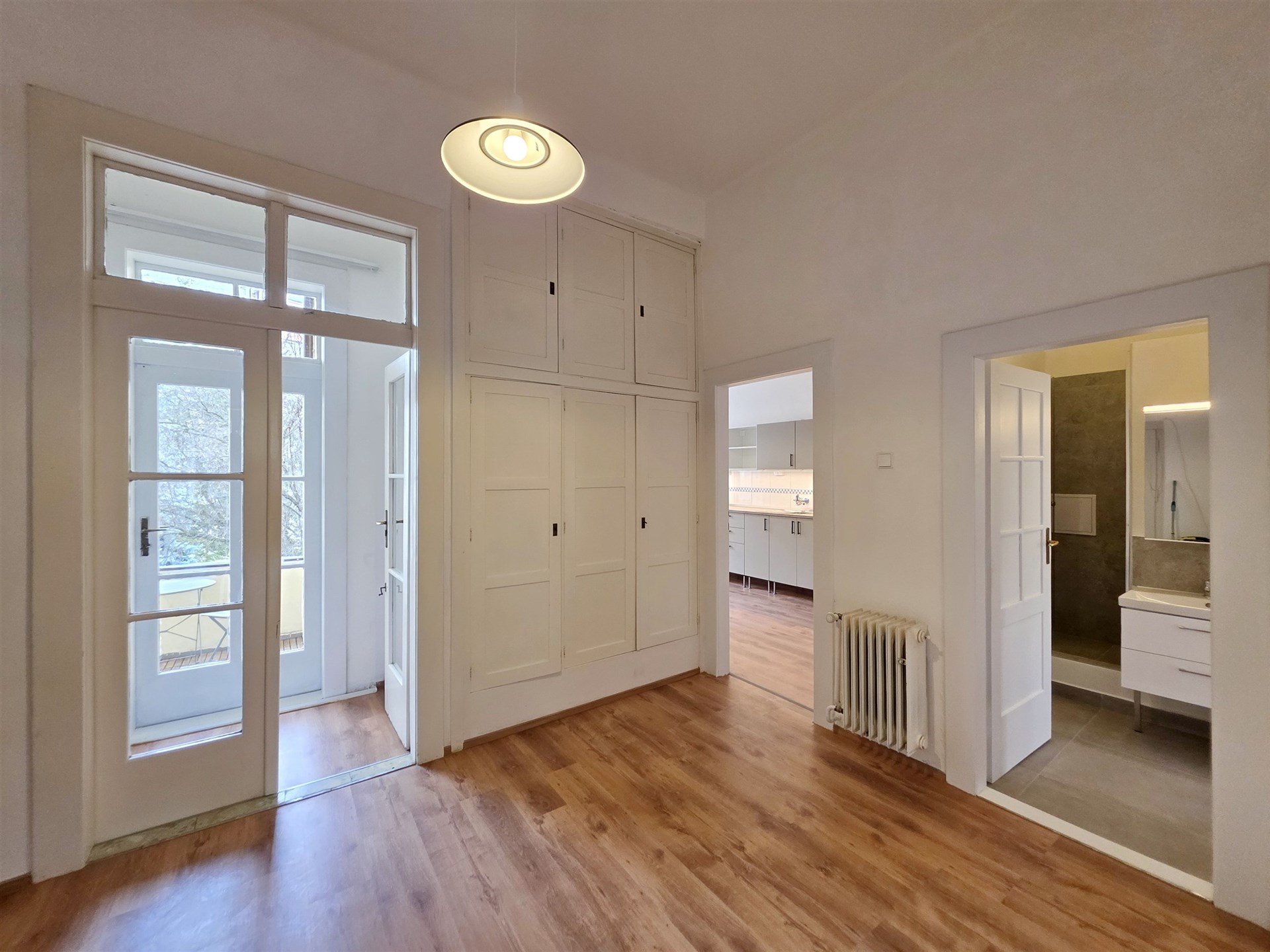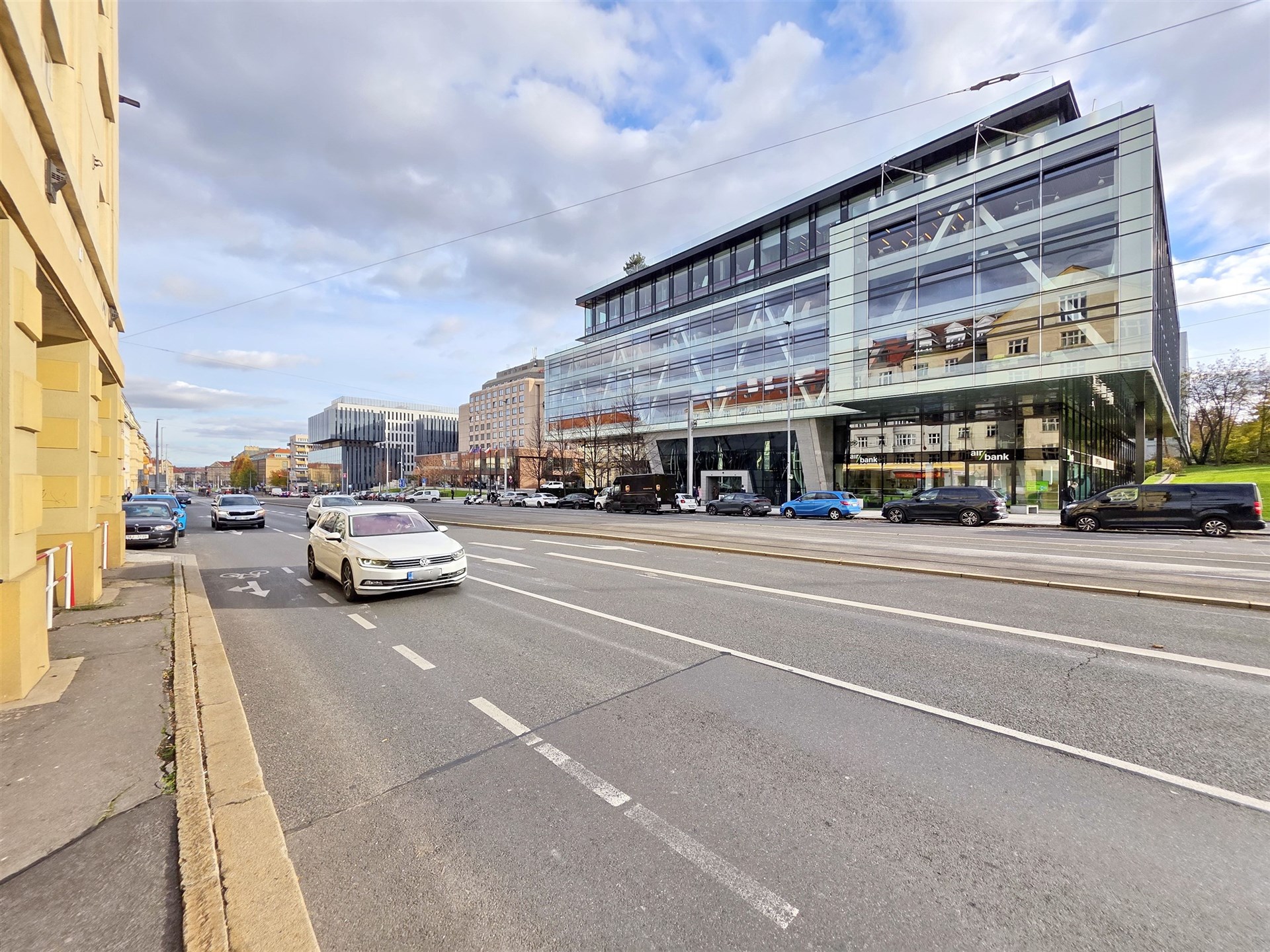 The apartment is on the first floor of a building with an elevator. The view from the apartment is oriented towards the west and east, indicating that the space is beautifully lit throughout the day. Parking is possible directly on the street in front of the building, which is always a big plus in the densely built-up areas of Prague.