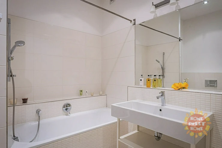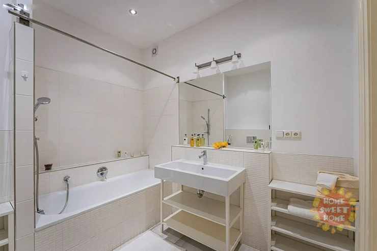 spacious entrance hall with built-in wardrobes, living room with modern fully equipped kitchen, one separate room, bathroom with bathtub and separate toilet. High ceilings, beautiful wooden parquet floors - all this underlines the historical yet modern character of this housing.