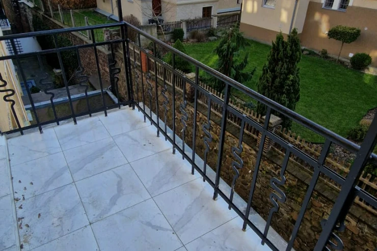 Kuchyně je moderní, s vestavěnými spotřebiči. Z kuchyně je přístup na balkon, situovaný směrem do dvora a na jižní stranu. Na podlahách jsou původní, renovované parkety a dlažba. Celkově byt působí velmi světlým a prostorným dojmem – kombinuje prvky historické architektury s moderním standardem bydlení.