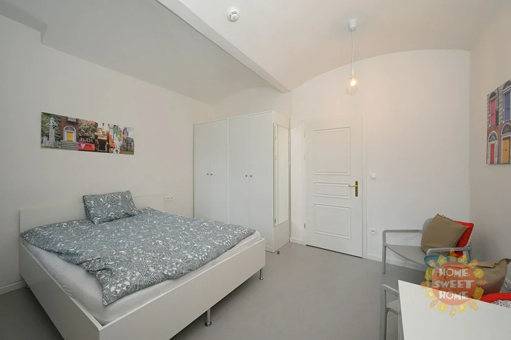 A beautiful furnished room with a double bed, with a total area of 15 m², with a shared furnished kitchen with a dining area, bathroom with shower, and toilet, located in the Kinských Residence on the lower ground floor of a brick building on Kinských Square, Prague 5. The building underwent a complete renovation in 2019.