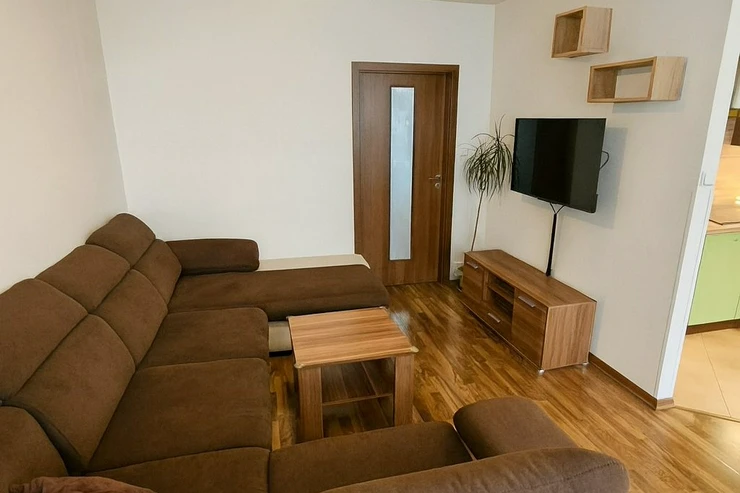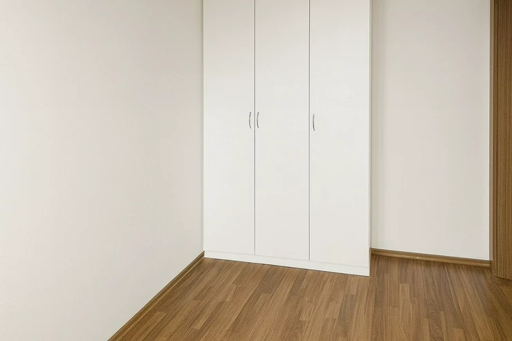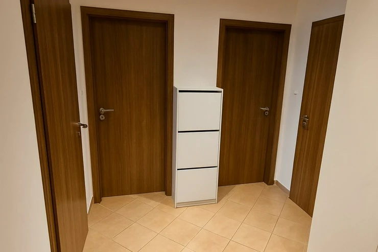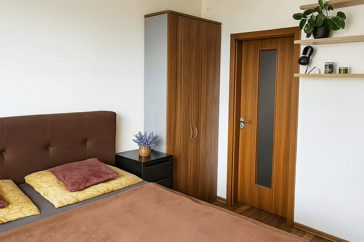The apartment features two separate bedrooms, both oriented to the west — offering pleasant coolness in the morning. Since there are no residential units above the apartment, it ensures quiet and uninterrupted sleep. The bedrooms are furnished with large wardrobes, a bookshelf, and a double bed.