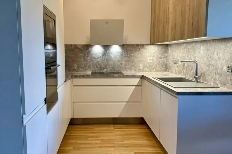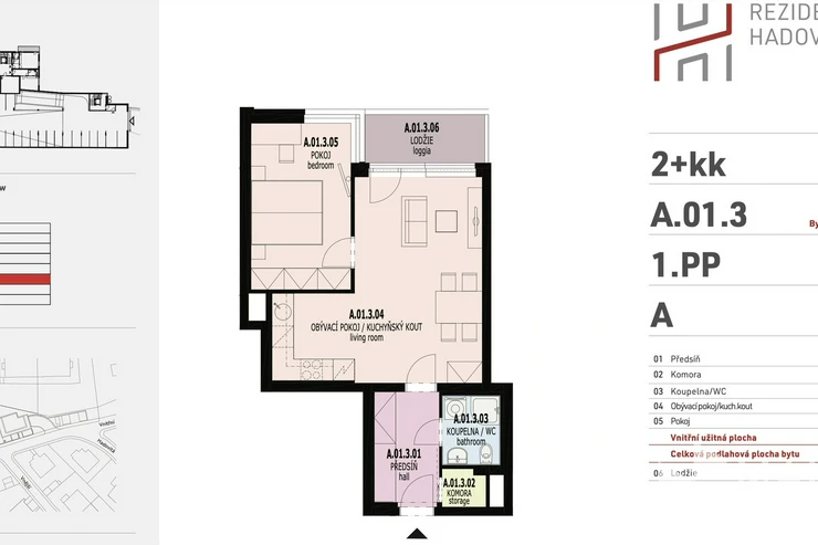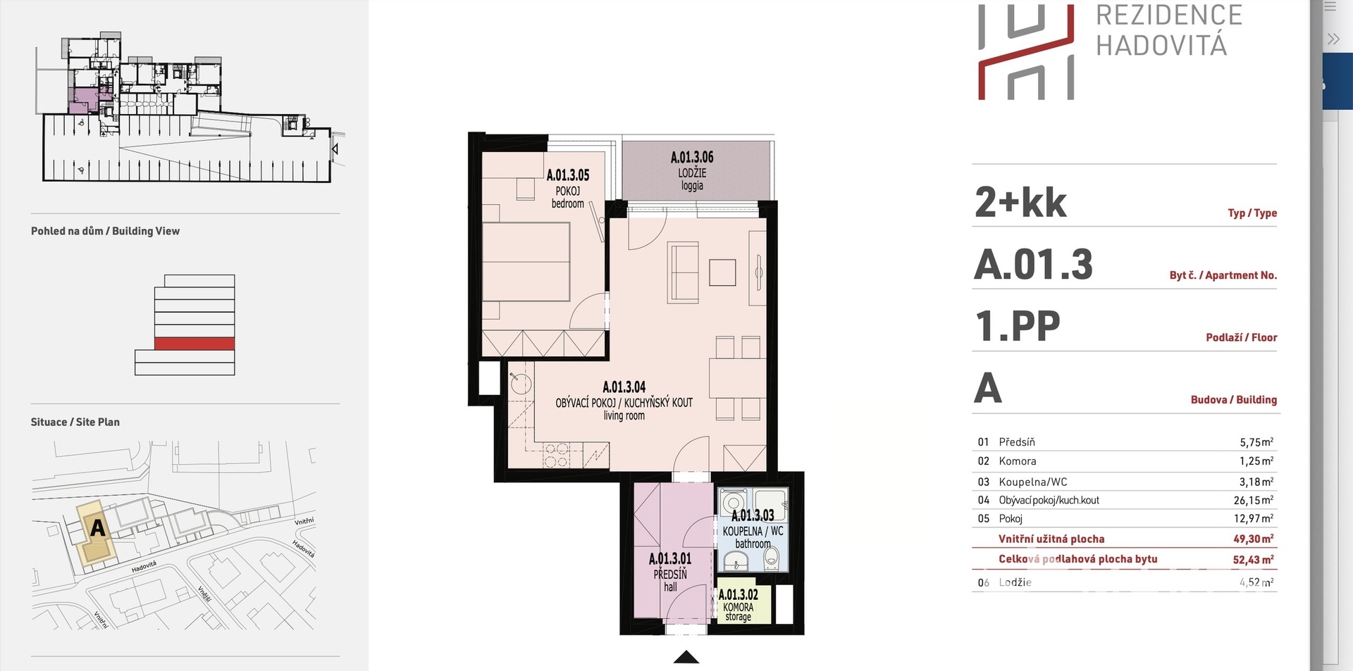 The apartment is situated in a modern residential building called Rezidence Hadovitá, built into a hillside. While the apartment is officially registered on the -1st floor (1.PP), in reality, it is located on the 3rd above-ground floor, as there are two full floors below it. Thanks to this unique position, the apartment receives plenty of natural light and offers pleasant open views.