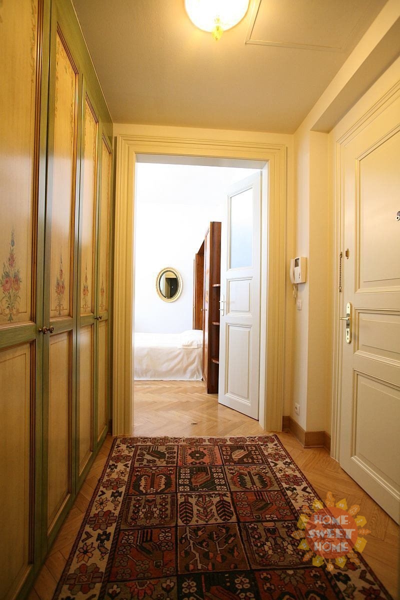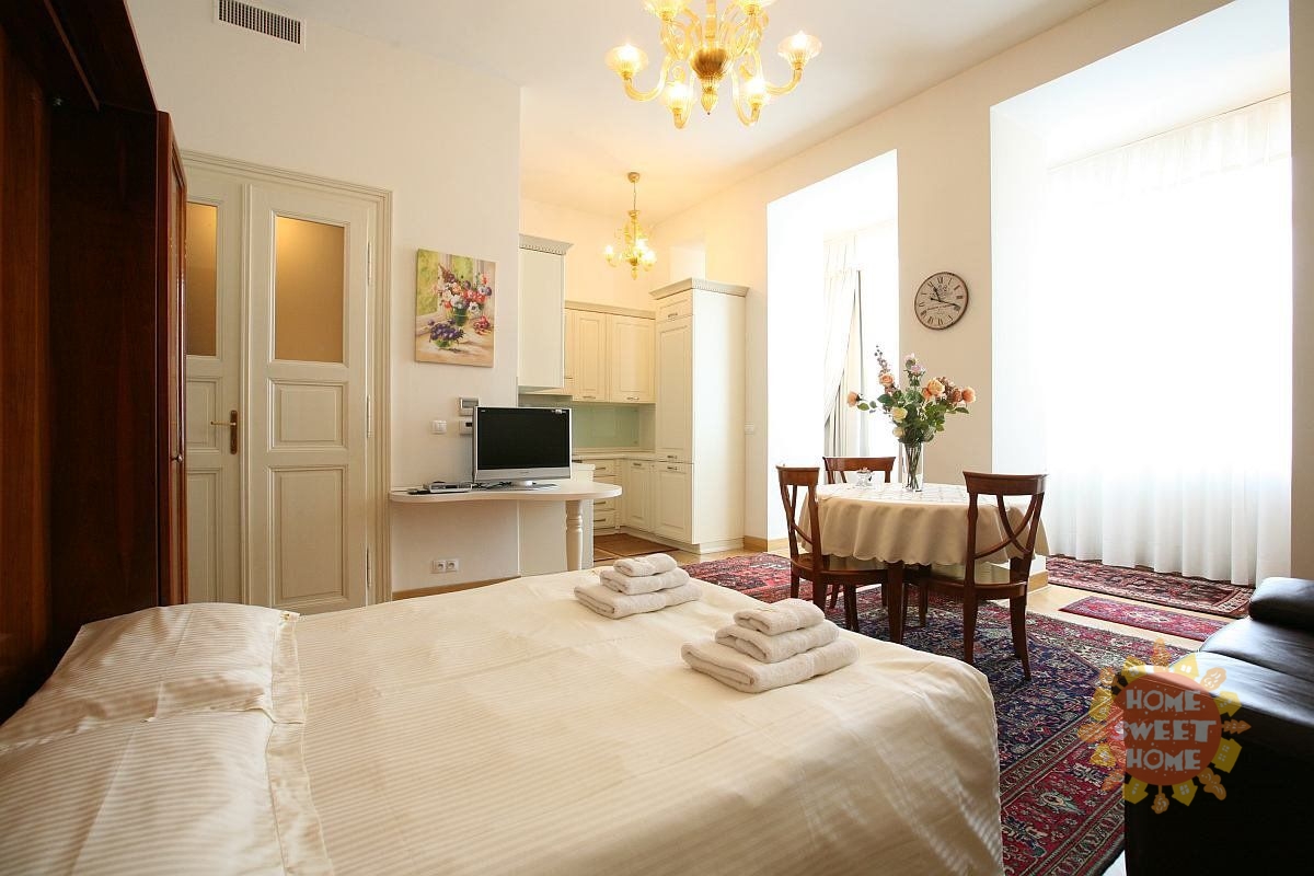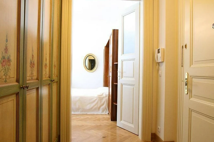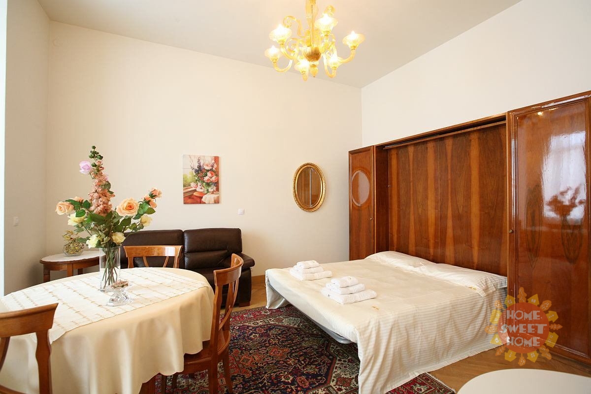 Prague, luxury air-conditioned apartment 1 + kk for rent located in the prestigious area of Vinohrady, 50m from a beautiful park with church Saint Ludmila. The apartment is located on the 3rd floor with a lift in a brick house. Flat satisfy the most exacting. It is furnished according to all your needs (eg, porcelain, crystal glasses. Fully equipped kitchen - pots, cutlery, tablecloths). Bathroom with bath, toilet. There is also a washing machine. There are Persian carpets, LCD TV, internet, fixed telephone lines, door phones, etc. There is a heated swimming pool with hydro massage and a garage. Excellent connections to the city - metro line A bus stop directly in front. Wenceslas Square is just 5 minutes walk. The video of the apartment is from an identical apartment, only this apartment does not have a terrace to the courtyard.