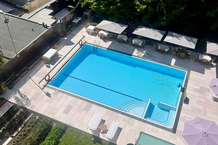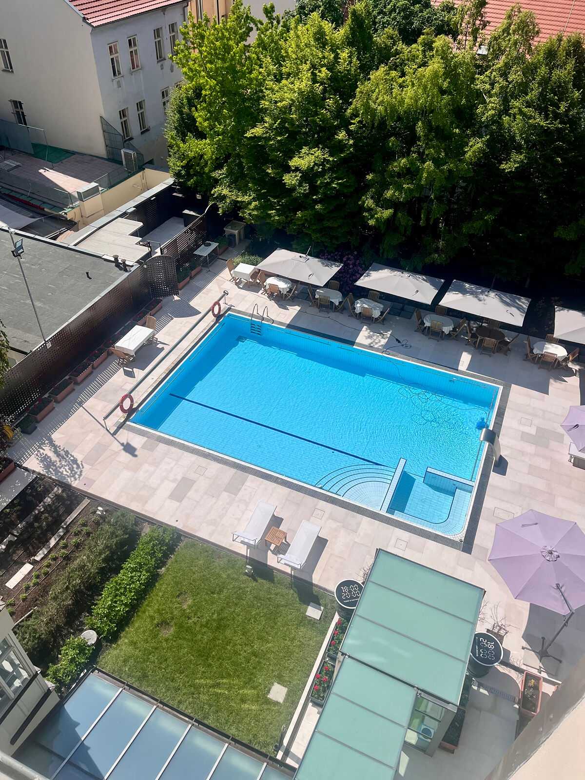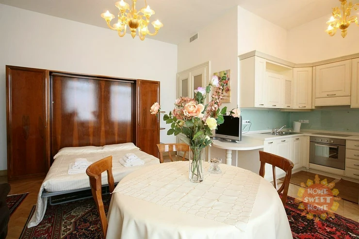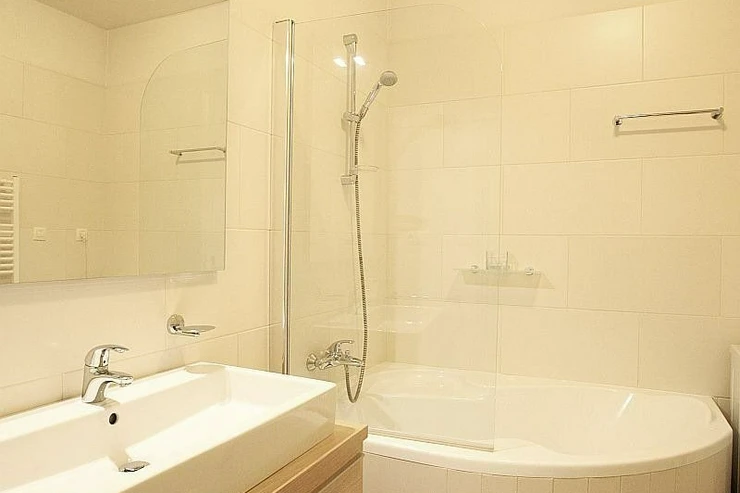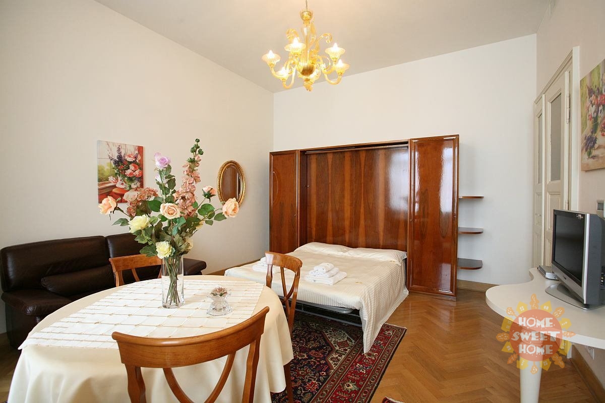 Prague, luxury air-conditioned apartment 1 + kk for rent located in the prestigious area of Vinohrady, 50m from a beautiful park with church Saint Ludmila. The apartment is located on the 3rd floor with a lift in a brick house. Flat satisfy the most exacting. It is furnished according to all your needs (eg, porcelain, crystal glasses. Fully equipped kitchen - pots, cutlery, tablecloths). Bathroom with bath, toilet. There is also a washing machine. There are Persian carpets, LCD TV, internet, fixed telephone lines, door phones, etc. There is a heated swimming pool with hydro massage and a garage. Excellent connections to the city - metro line A bus stop directly in front. Wenceslas Square is just 5 minutes walk. The video of the apartment is from an identical apartment, only this apartment does not have a terrace to the courtyard.